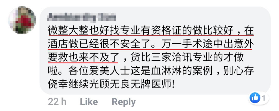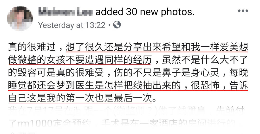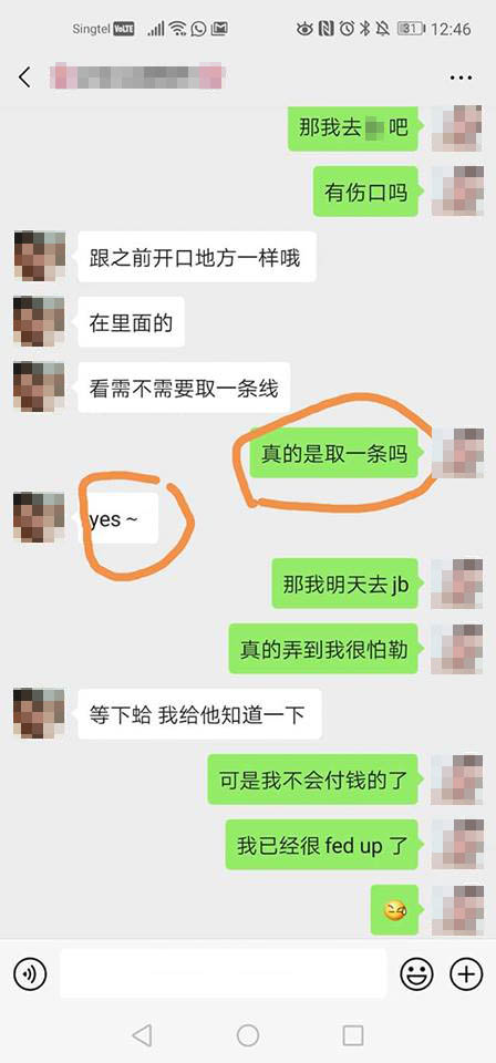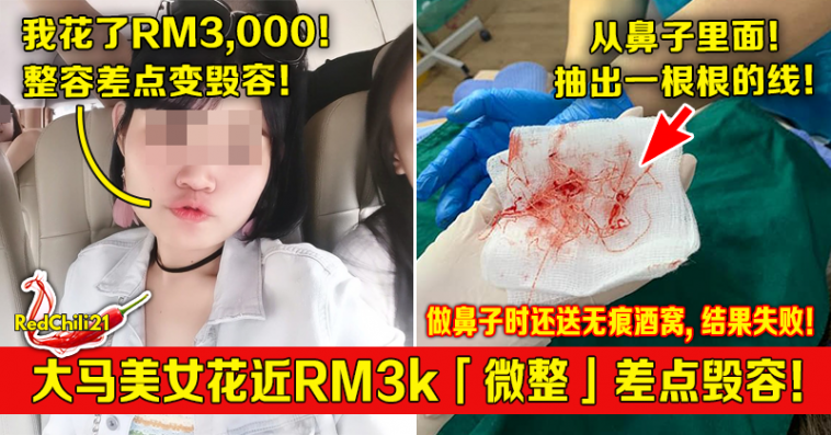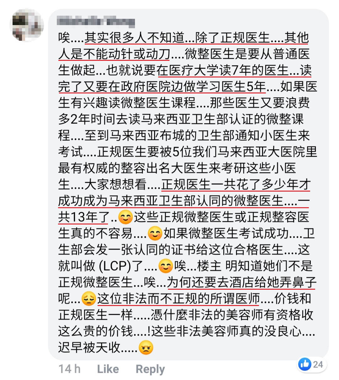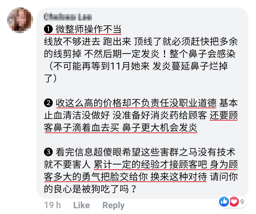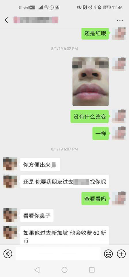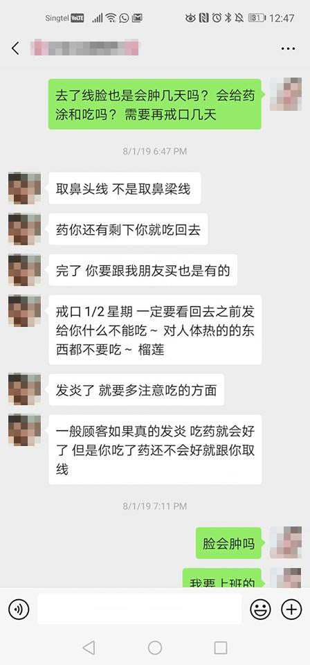 我在7月17号在XX跟一个(微整师?)做了线雕鼻,先前付了RM1,000定金预约,手术是在一家酒店的房间进行的,全费是RM2,990。术后是没有给任何的药和药膏,叫我自己去farmasi 买。我就这样鼻子滴着血的一个人跑去买药和盐水,然后就回去新加坡。
