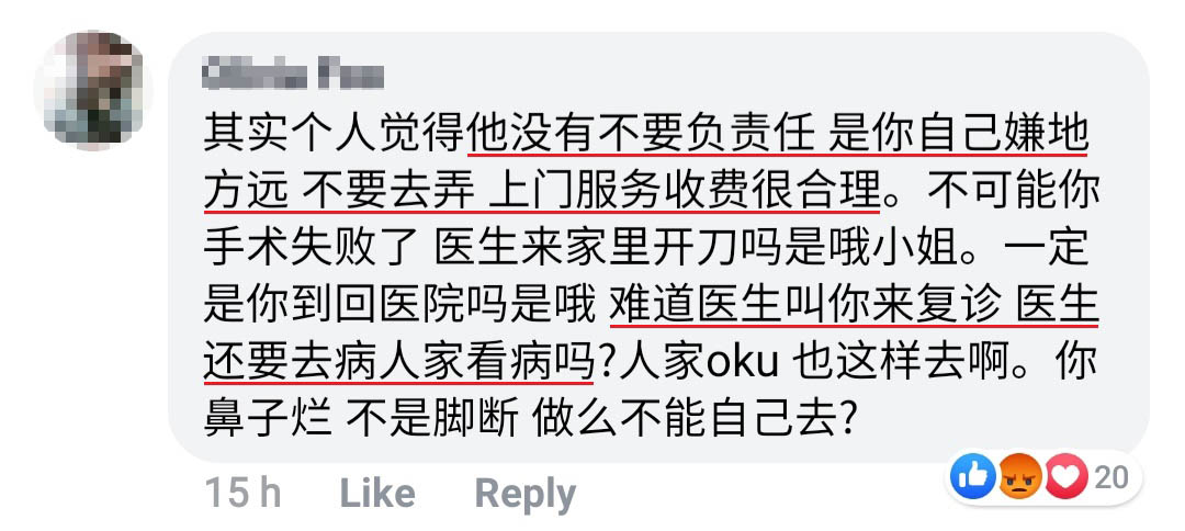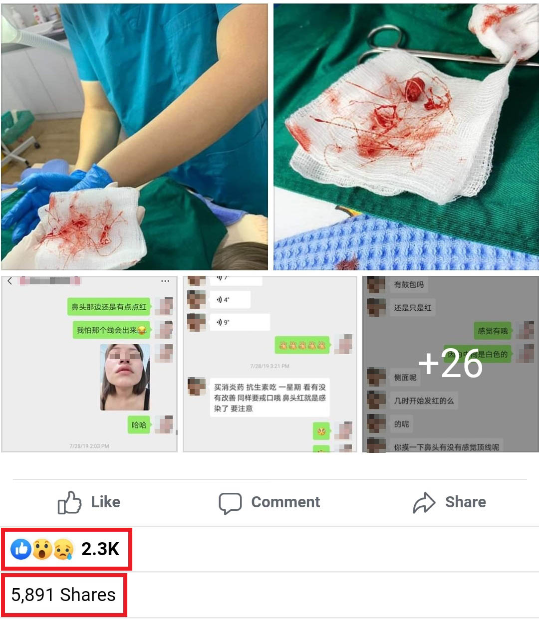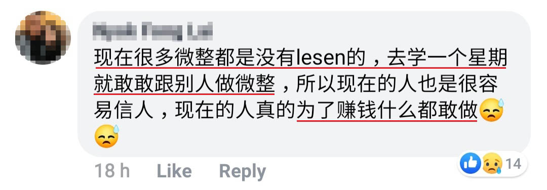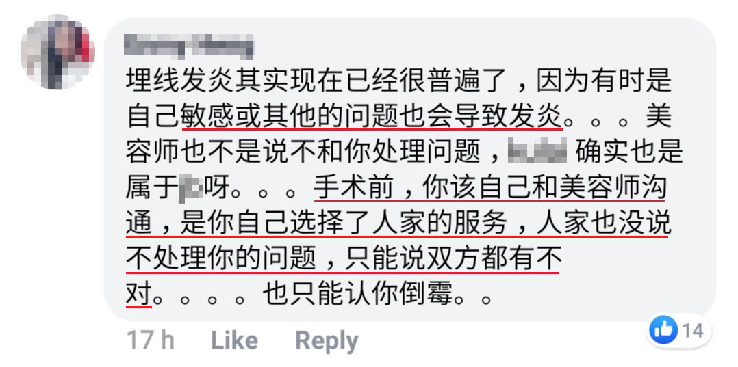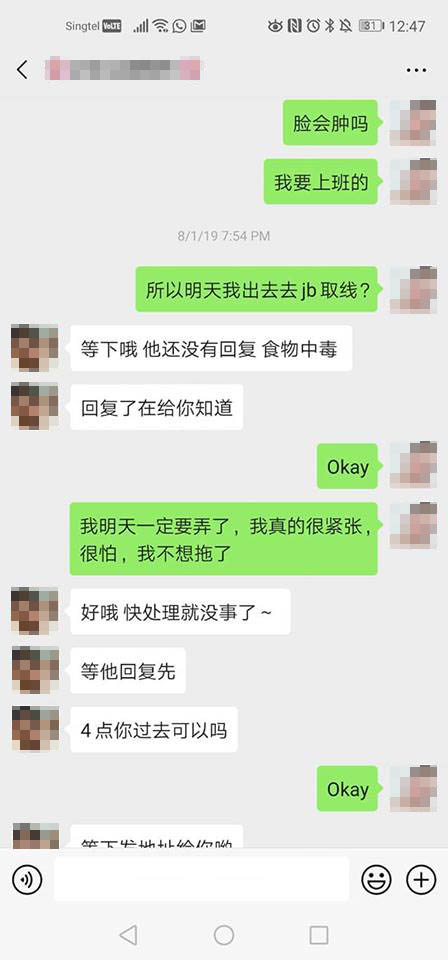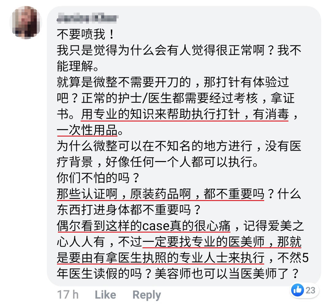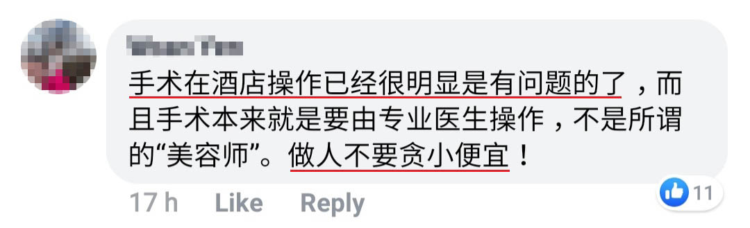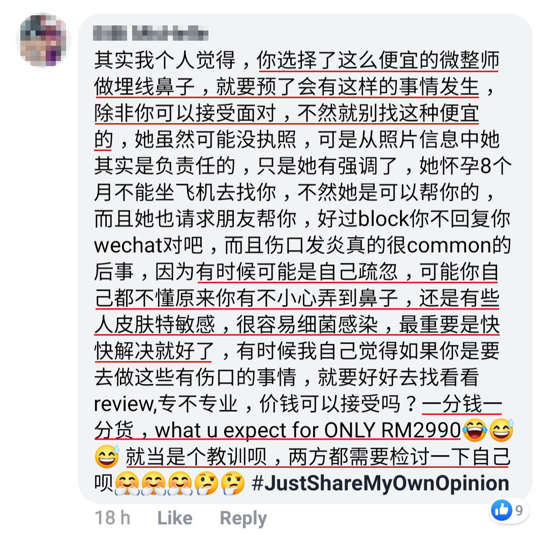 我在7月17号在XX跟一个(微整师?)做了线雕鼻,先前付了RM1,000定金预约,手术是在一家酒店的房间进行的,全费是RM2,990。术后是没有给任何的药和药膏,叫我自己去farmasi 买。我就这样鼻子滴着血的一个人跑去买药和盐水,然后就回去新加坡。