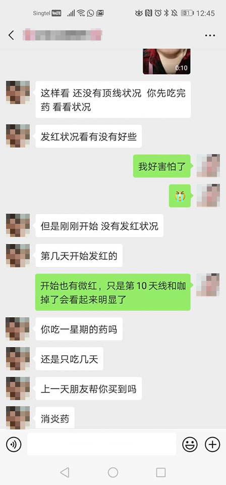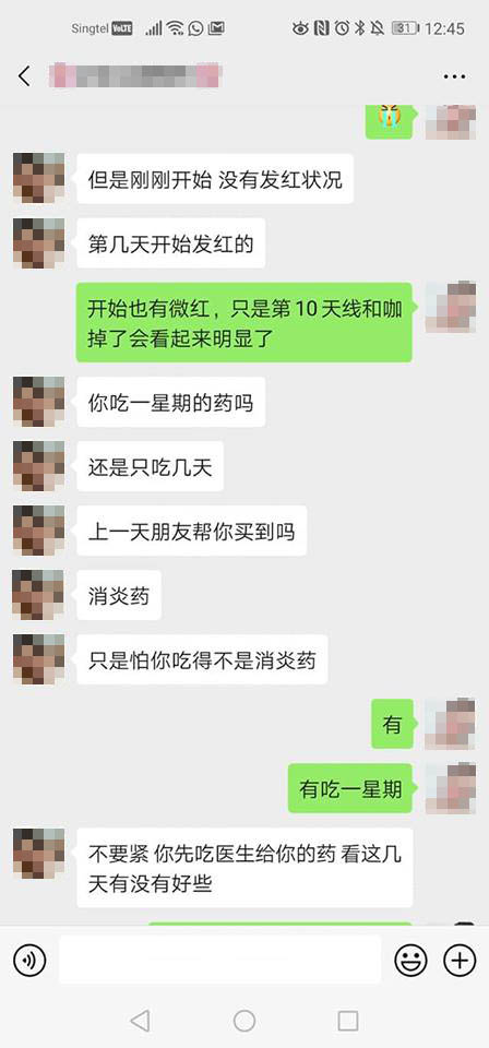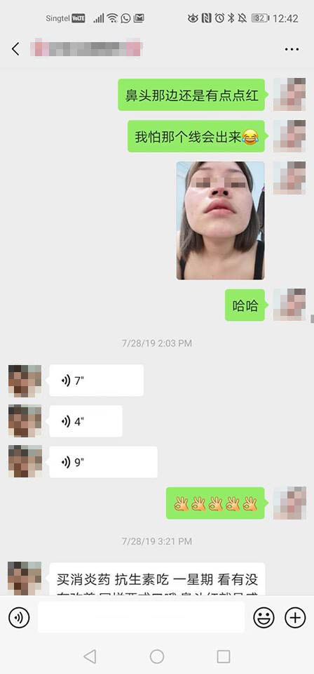 手术后差不多2个星期,肿消了,可是鼻头就还是红红的,问了帮我做的(微整师?)她一开始就叫我买抗生素消炎药吃,过了几天鼻头还是发红,我真的很害怕了,她告诉我是可能是顶线了,叫我去XXXXX找她朋友帮我取出”一根”线(当初埋的配套是鼻头6根,鼻小主8根,鼻背18根),我看到她这样回复就更害怕了,我问她本人在哪里她说在XXXX,还说如果觉得古来远就去XXXX找她(我住在新加坡)。