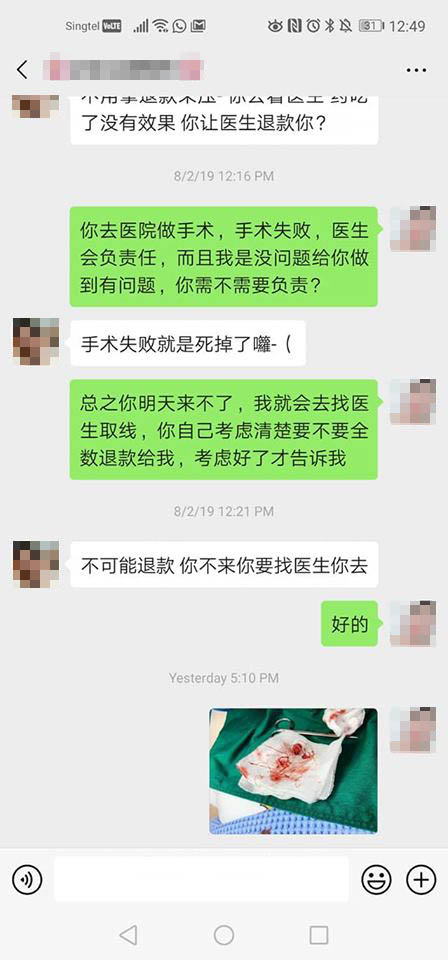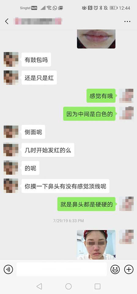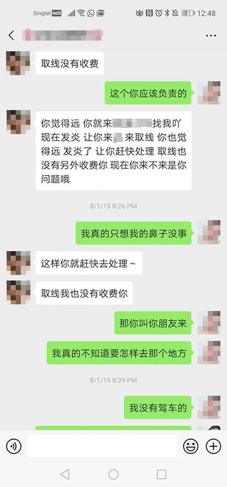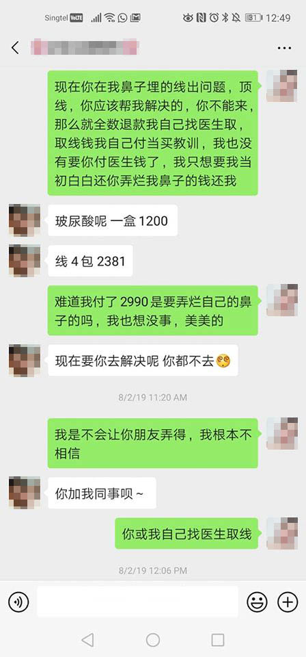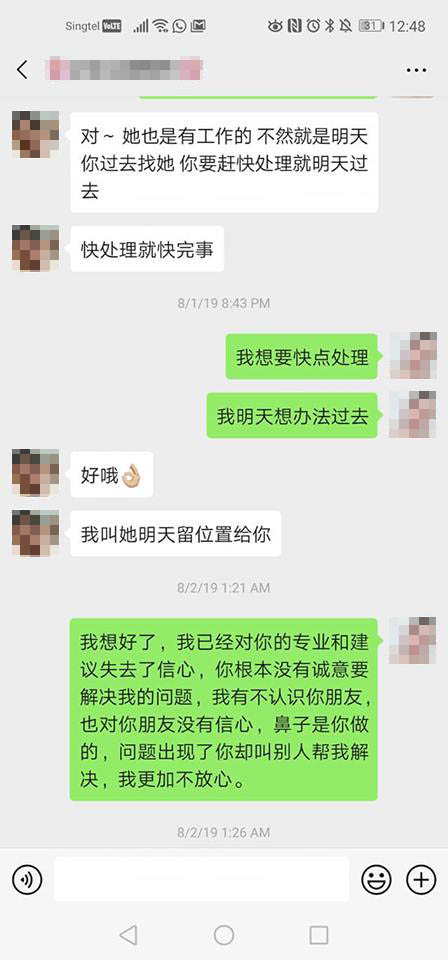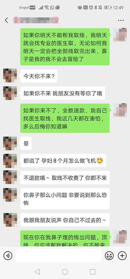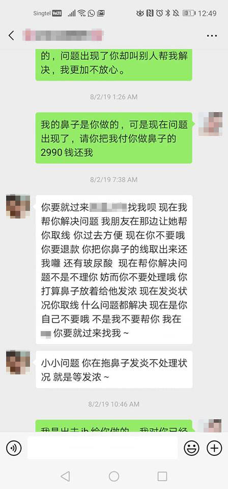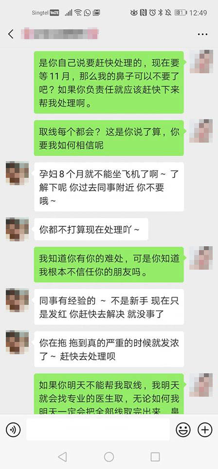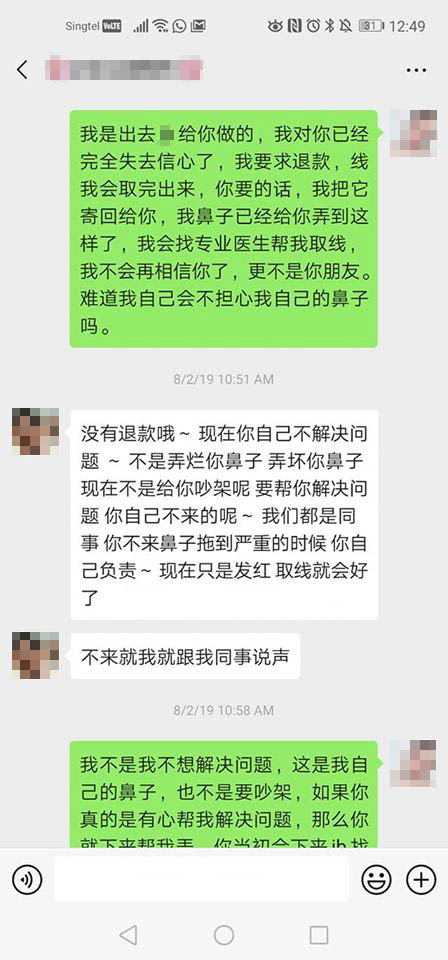 当时我看到这样的回复真的完全傻眼了,心里非常害怕,纠结了一个晚上我终于敢告诉我的家人和男朋友(我是自己一个人住的),决定了要去找正规医生处理。有问她退款,她不肯,还说我叫你去我朋友那边取线已经没有收你钱了(她发给我她朋友的地址,是住家来的,一定不是正规医生,说是她同事有经验的,叫我怎么相信?我的鼻子已经被她弄到这样了,我还会回去给她那个”我都不懂是谁”的朋友帮我取线? 叫她下来XX帮我解决,她说自己是孕妇8个月不能搭飞机(可是2个星期前她却能下来XX帮我做鼻子?),就一直说有本事就去XXXX找她。