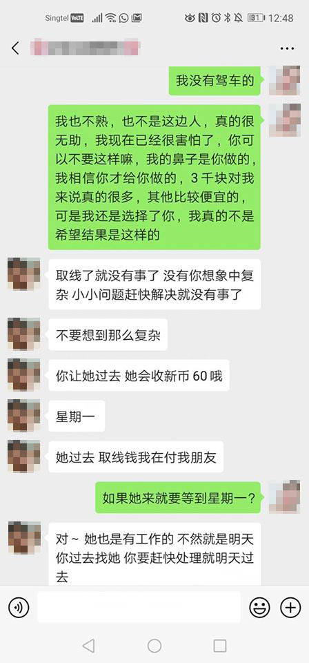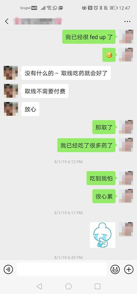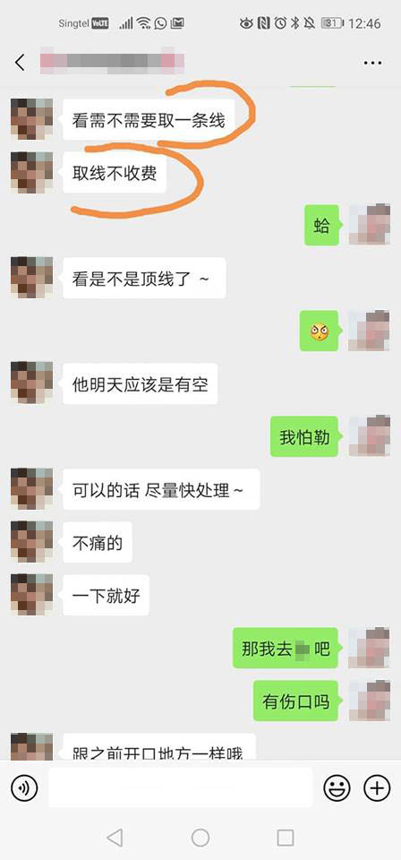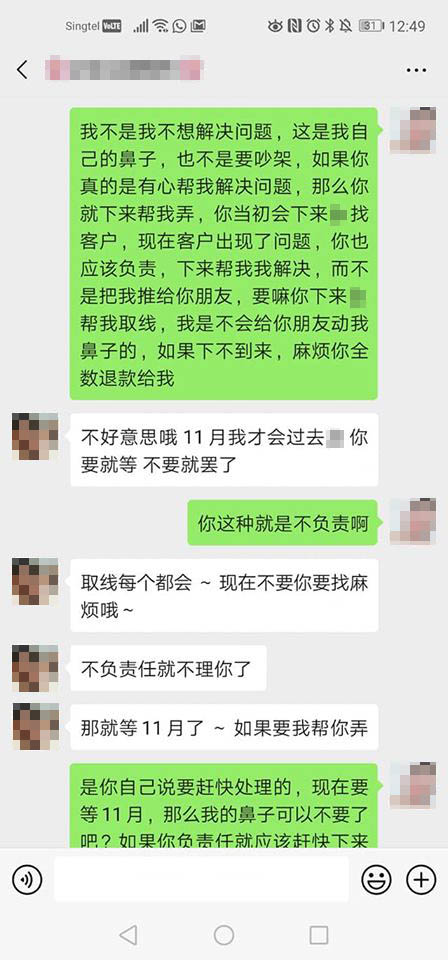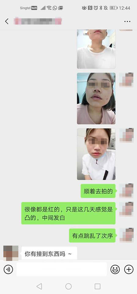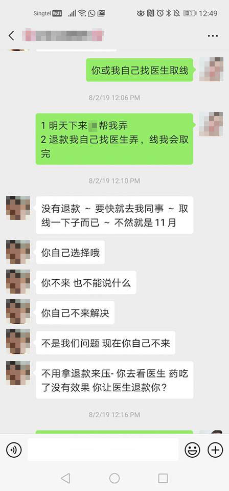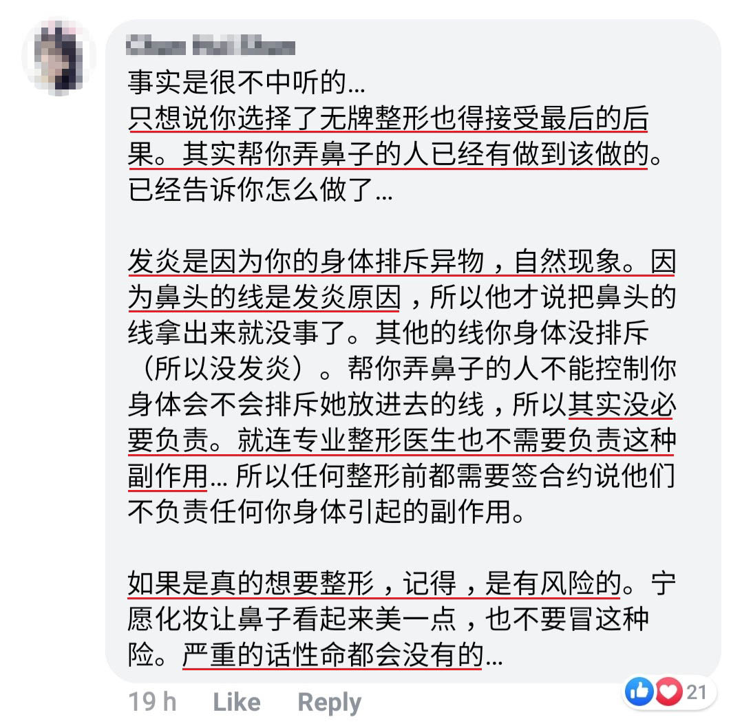 当时我看到这样的回复真的完全傻眼了,心里非常害怕,纠结了一个晚上我终于敢告诉我的家人和男朋友(我是自己一个人住的),决定了要去找正规医生处理。有问她退款,她不肯,还说我叫你去我朋友那边取线已经没有收你钱了(她发给我她朋友的地址,是住家来的,一定不是正规医生,说是她同事有经验的,叫我怎么相信?我的鼻子已经被她弄到这样了,我还会回去给她那个”我都不懂是谁”的朋友帮我取线? 叫她下来XX帮我解决,她说自己是孕妇8个月不能搭飞机(可是2个星期前她却能下来XX帮我做鼻子?),就一直说有本事就去XXXX找她。