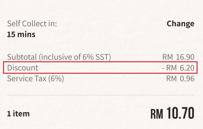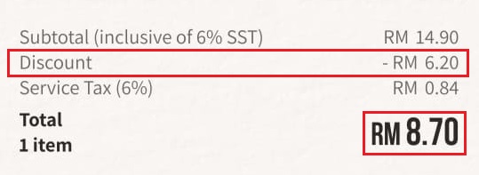 - 此优惠需要消费RM15以上才获得折扣