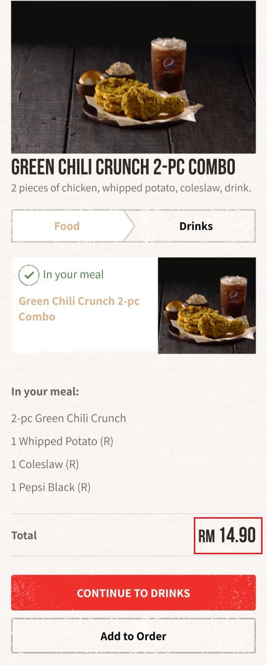 步骤8: 原价RM14.90折扣后一份Green Chili Crunch炸鸡套餐只需RM8.70