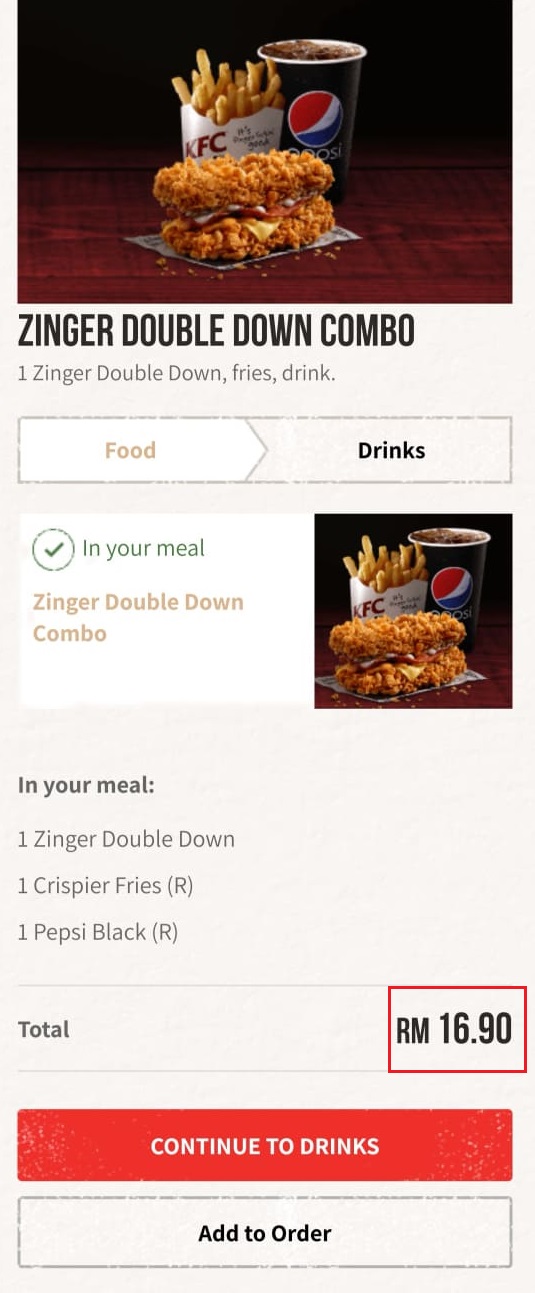 步骤6:原价套餐RM16.90折扣后一份Zinger Double Down 套餐只需RM10.70!