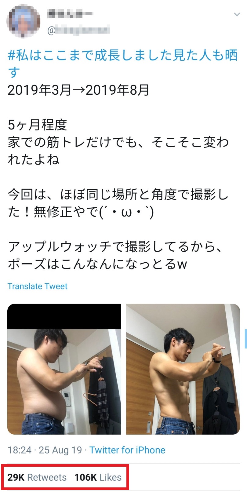 此外,该男子也在 Twitter 分享了自己的瘦身方式和这5个月的过程。他表示他的这一套瘦身方式无需特别控制饮食,也完全不需要去健身房,每天只需花费4分钟,在家里做高强度间歇训练就可以了!