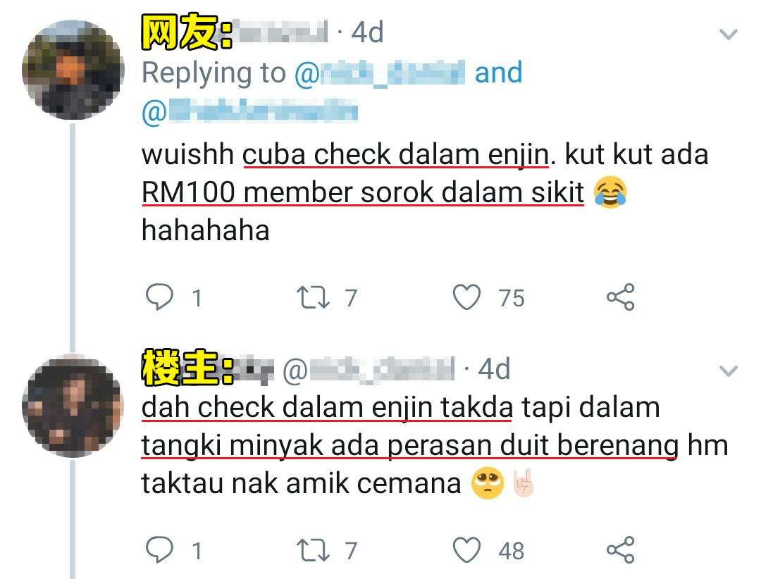 ▼ 一些网友还跟楼主说:「检查一下车子的引擎和油箱,搞不好也有钱在里面!」
