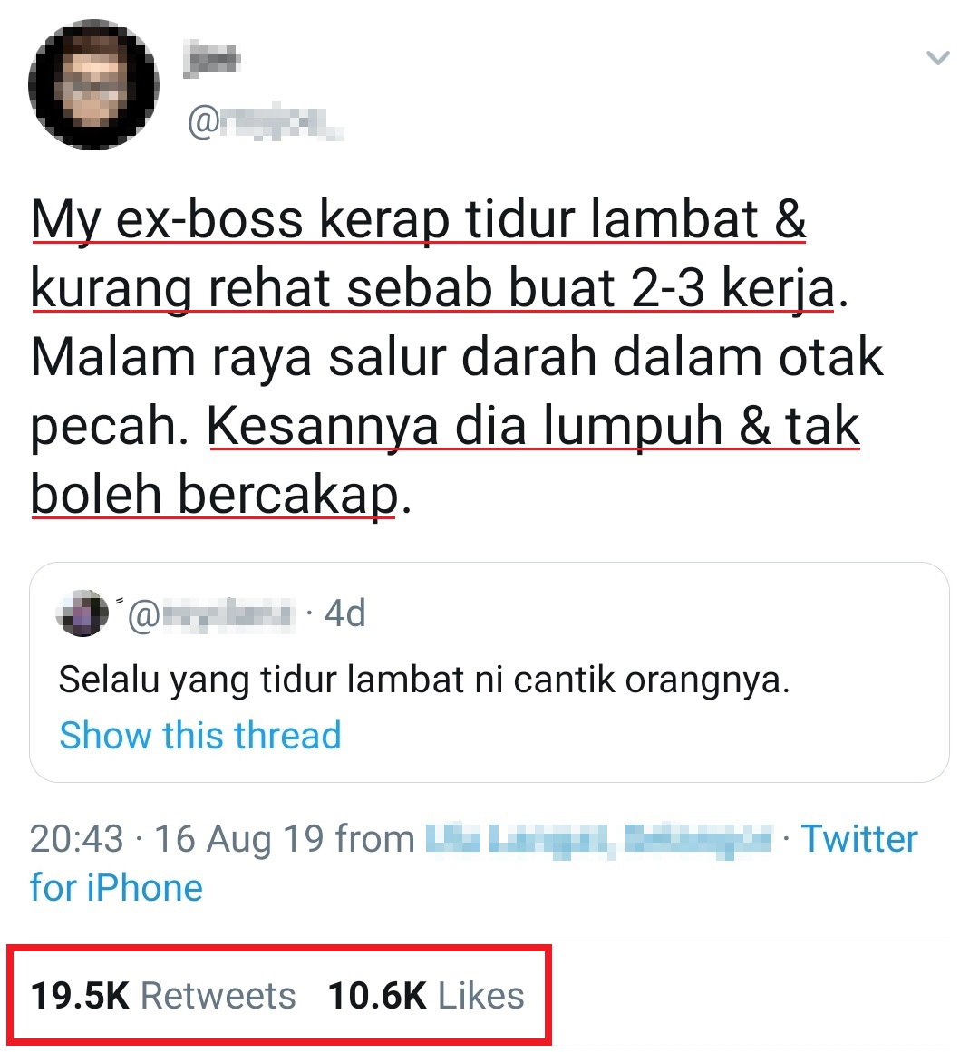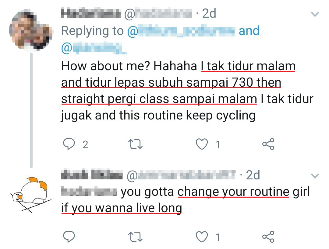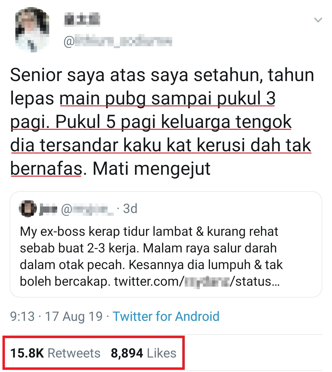 近日 Twitter 流传一个话题,就是关于“熬夜”。一名大马网友就分享了一个真人真事!