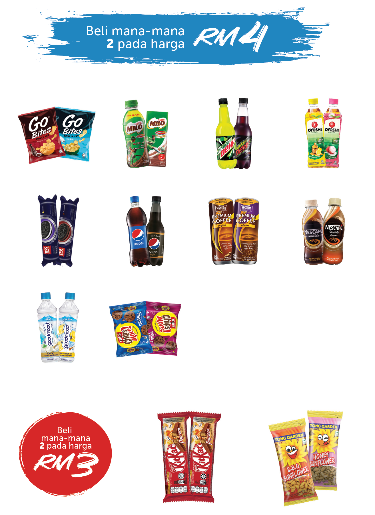 促销条件:购买2样指定的商品享优惠价格RM3或RM4