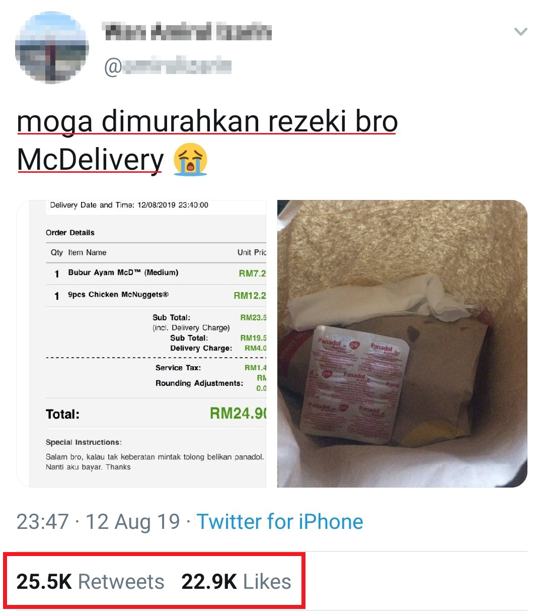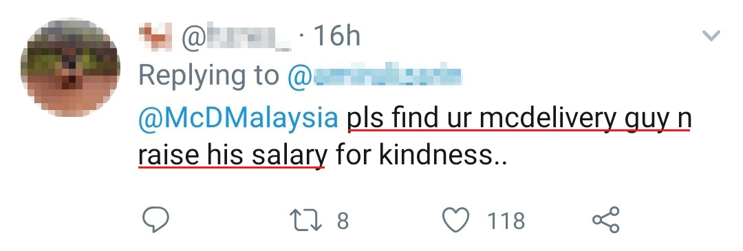 ▼ 网友 Tag 了大马麦当劳的官方 Twitter,请他们给这位外卖员加薪。