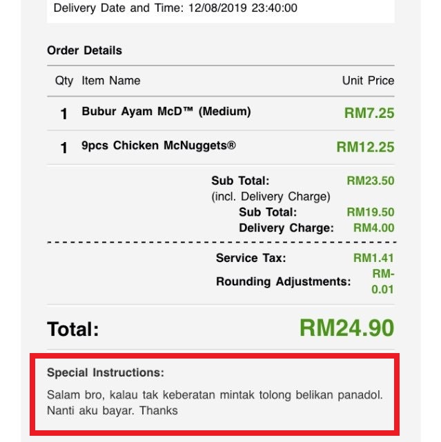 购买 McDelivery 餐点的同时,原PO在备注的位置写道:「你好,如果方便的话,麻烦你帮我买一个 Panadol,等下我还你钱。谢谢!」