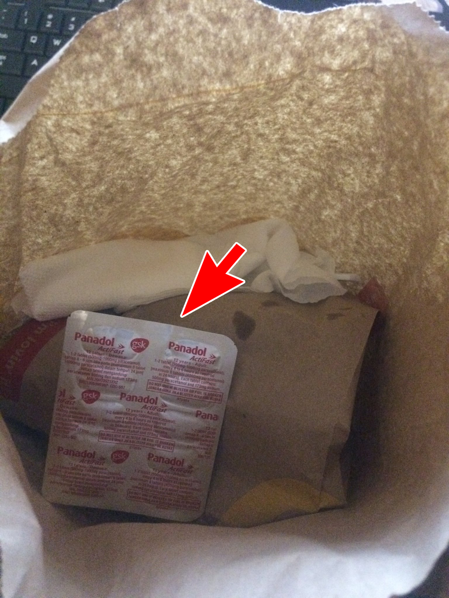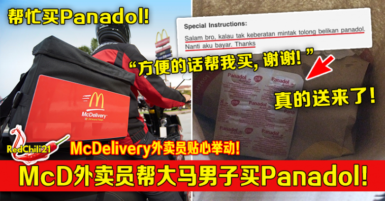 没想到,贴心的 McDelivery 外卖员还真的帮原PO买了 Panadol ,和他所购买的餐点放在一起,让原PO既惊喜又感动!