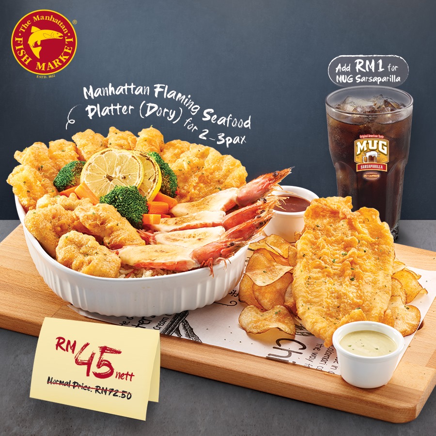 这份海鲜拼盘可供2人或3人共食!一份原价RM72.50优惠折扣只需RM45而已!而且额外加RM1获得一杯Mug Sarsaparilla!(这一份你可省下RM26.50)