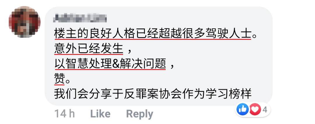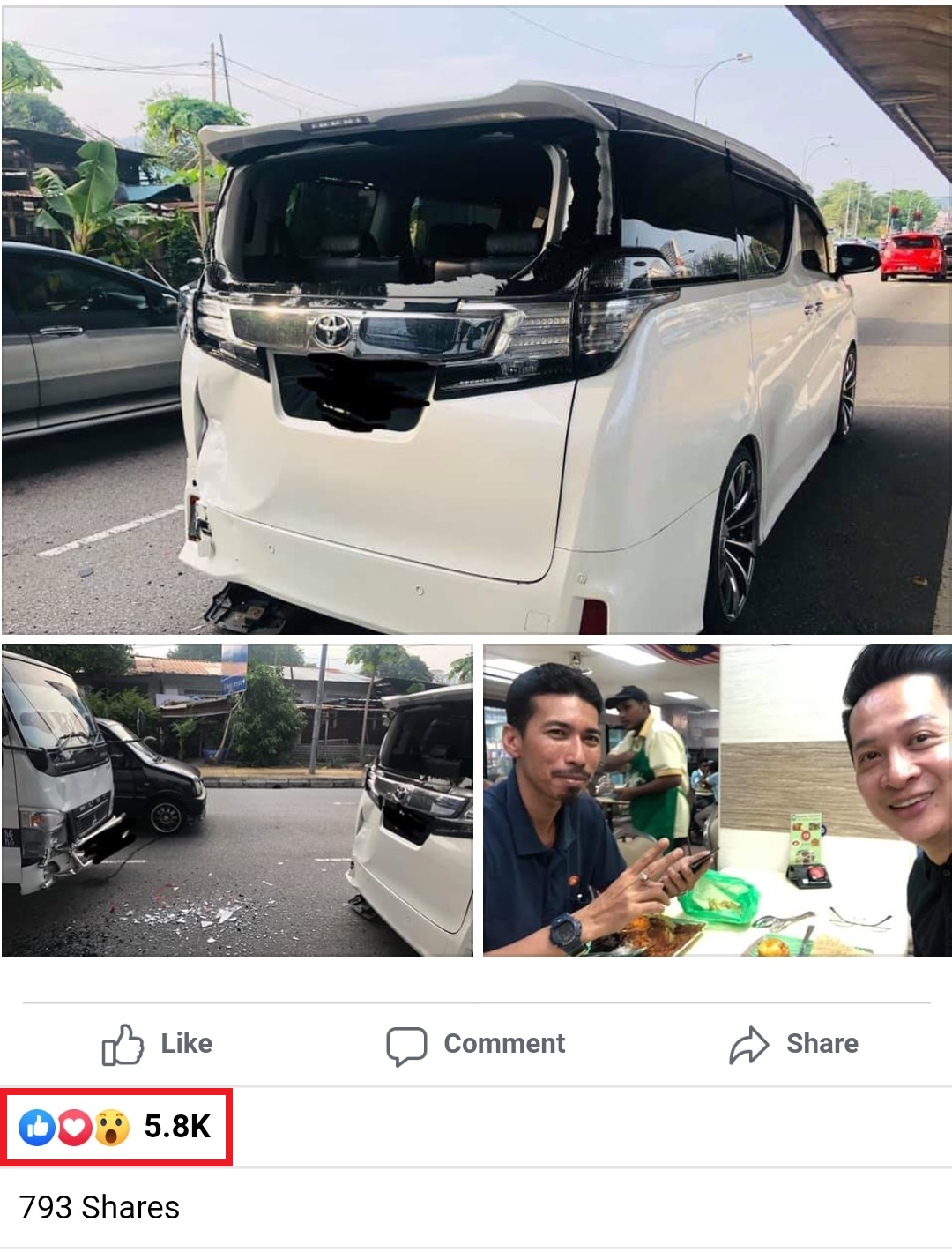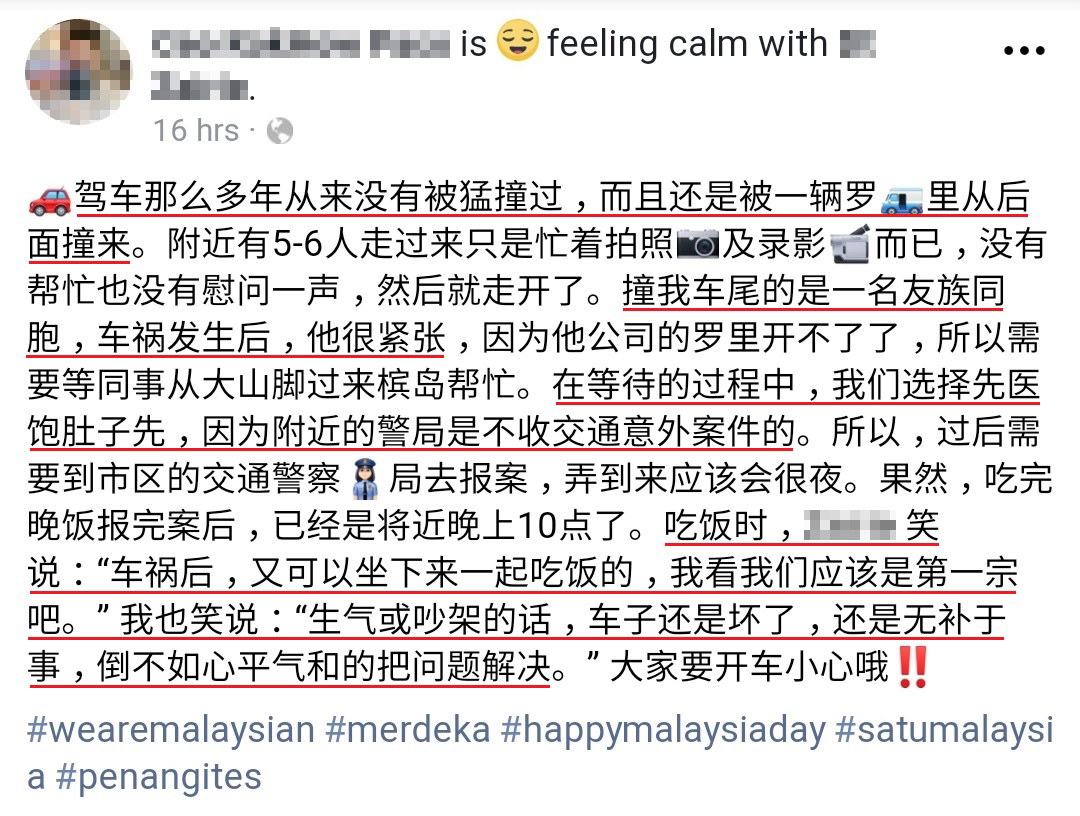 原PO在帖文里写道,昨天(9月6日)他在路上行驶时车子突然遭到撞击,后面被一辆罗里猛撞。肇事司机是一名巫裔司机,两人发生车祸后并没有发生任何争执,反而冷静地想办法解决。