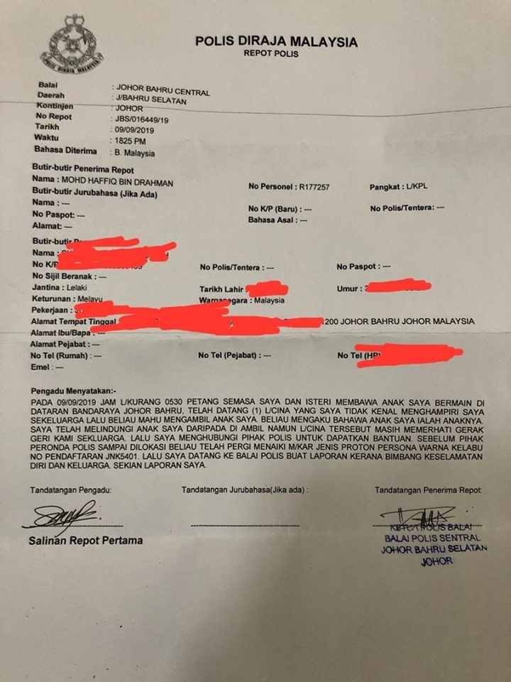 而报案纸的内容写道:这起事件发生在前天下午5时30分,一对父母带着3岁女童到新山大钟楼广场去玩乐。期间突然出现一名自称是女童父亲的华裔男子,试图要将女童带走。