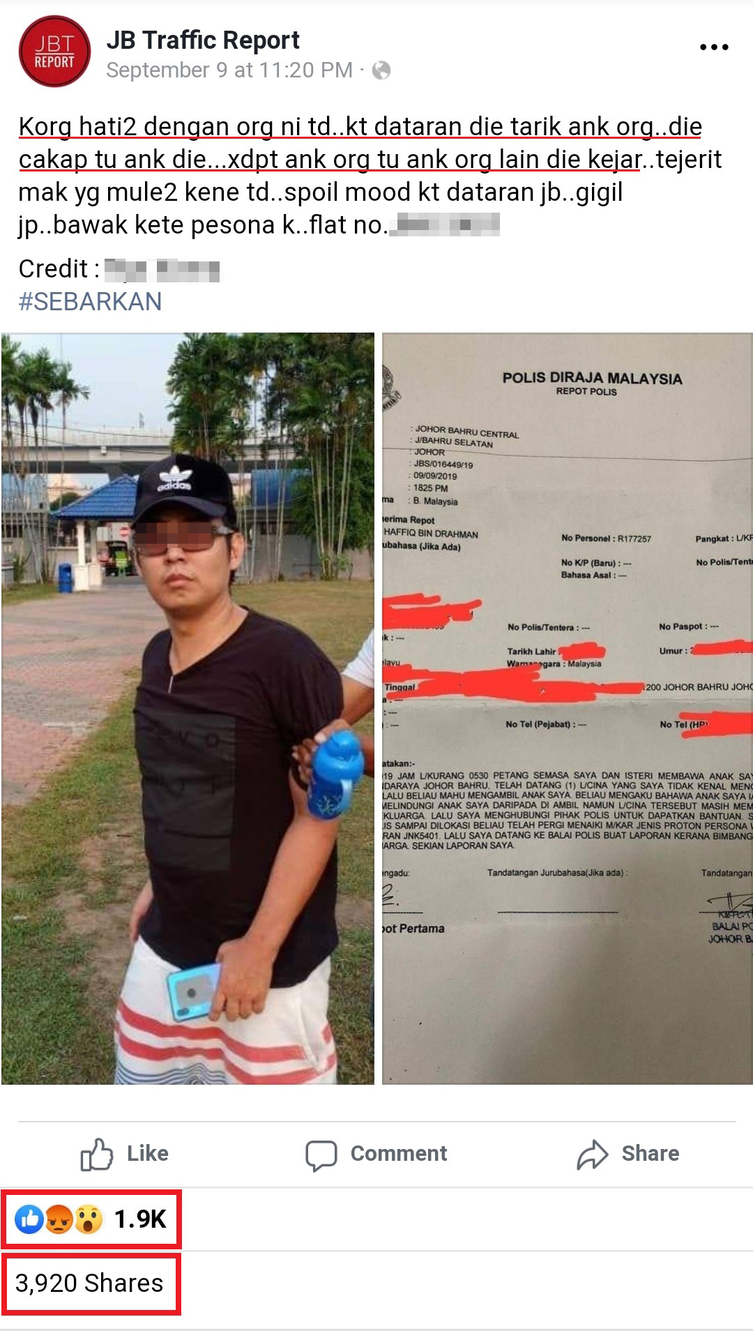 网友透过面子书专页《JB Traffic Peport》PO文,将此事分享出去并提醒大家。