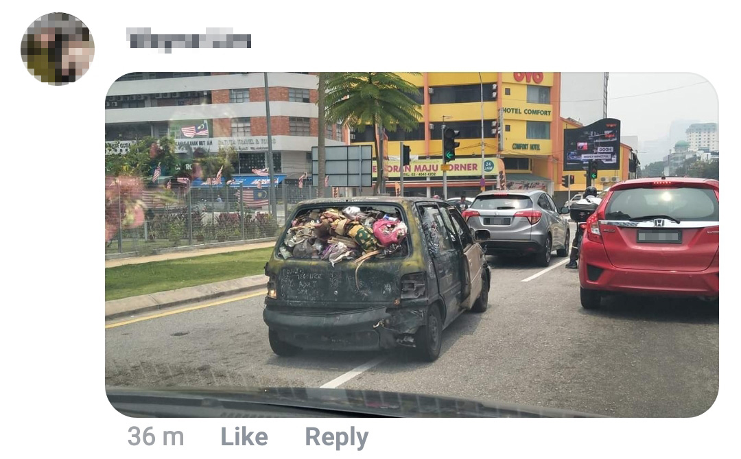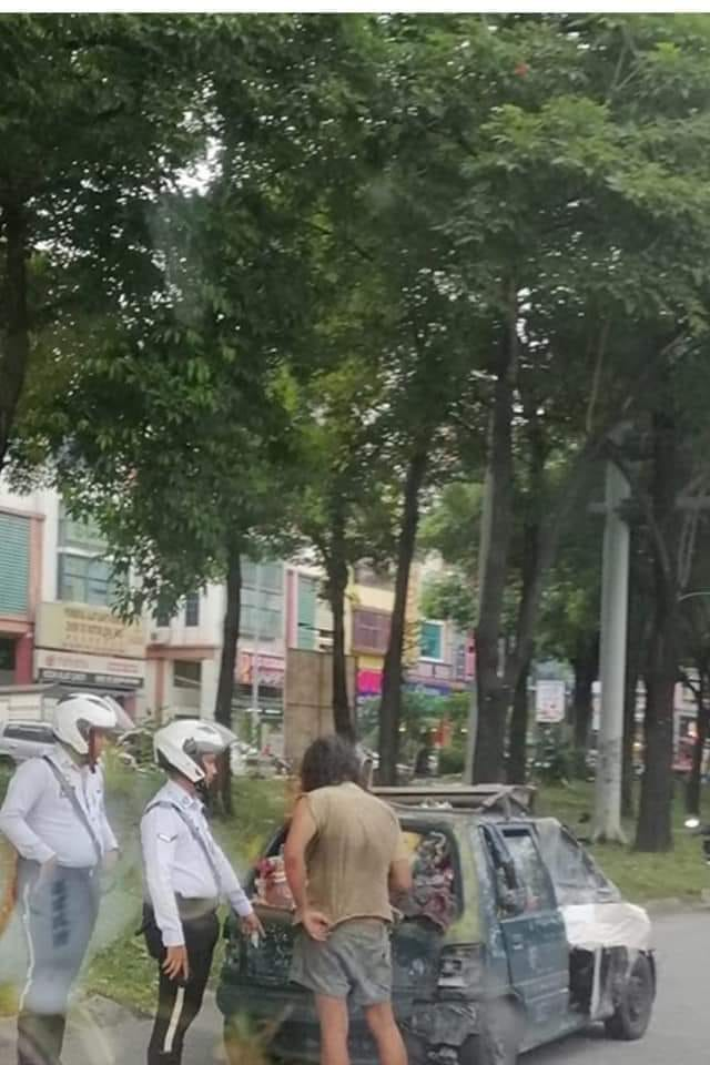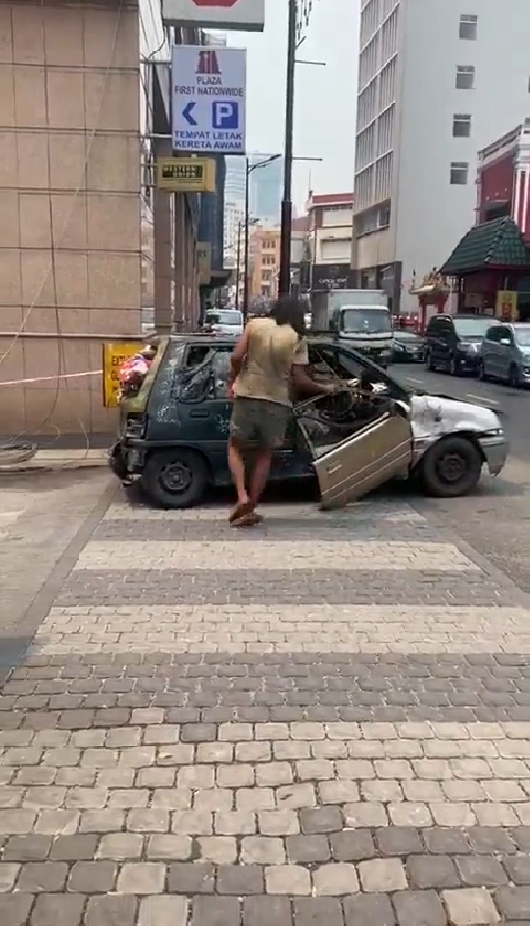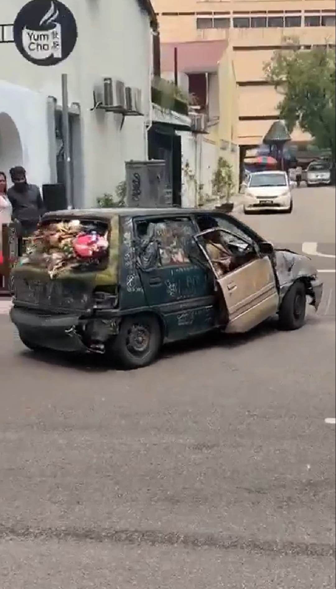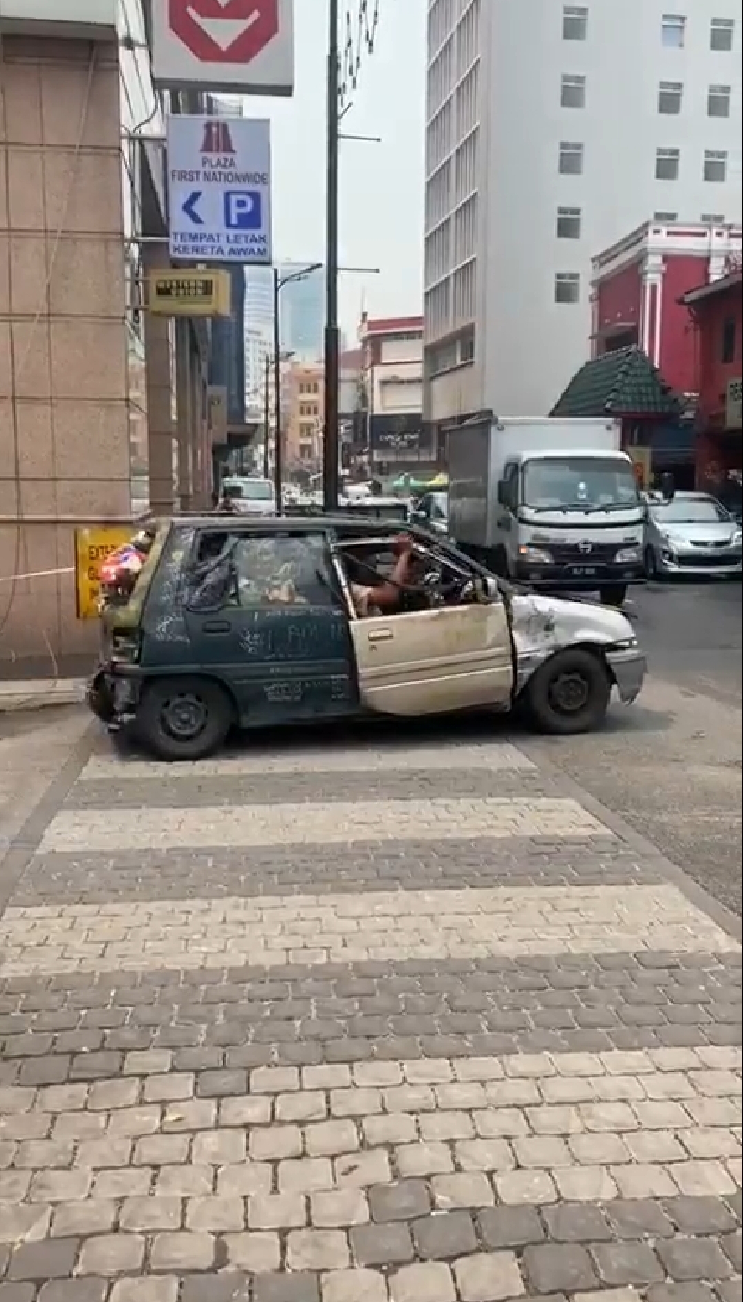 这辆装满回收物品和垃圾,又没有车牌的 Perodua Kancil,车的外观已经是破损到极致,却还能在马路上缓慢行驶。