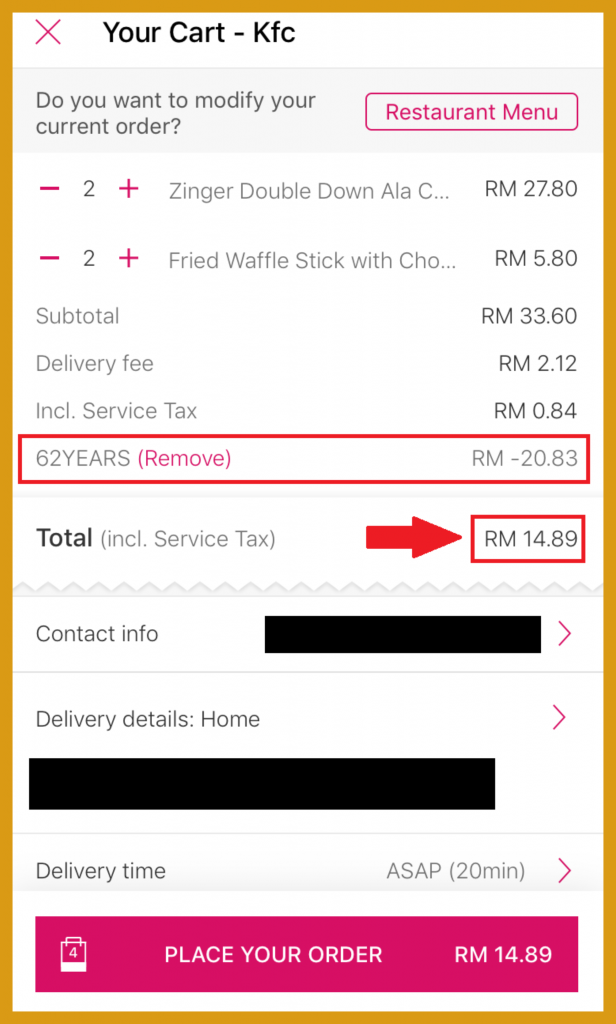 实不相瞒,小编已经订来吃了!2份Zinger Double Down + 2份Waffle Stick 只需RM14.89(已节省RM20.83)!算起来1 Set只需大约 RM7.50!不过要注意的是各个地区的外送费用可能会有所不同!
