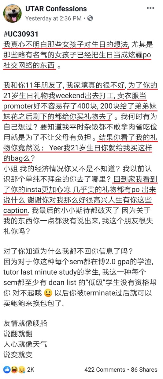 她坦言与这位朋友拥有11年的友谊,因为自己的家境不好,所以为了这位朋友21岁生日礼物!只好在周末打工当Promoter卖衣服~存到了RM400! RM200给自己的弟弟妹妹,并把剩下的钱购买一个包包送给寿星朋友!甚至没想到自己!