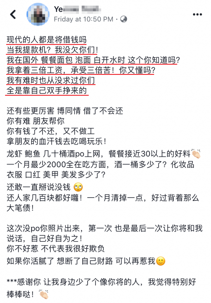 事后,Y女士并没有借钱给对方还把她们之间的对话截图放到脸书上!