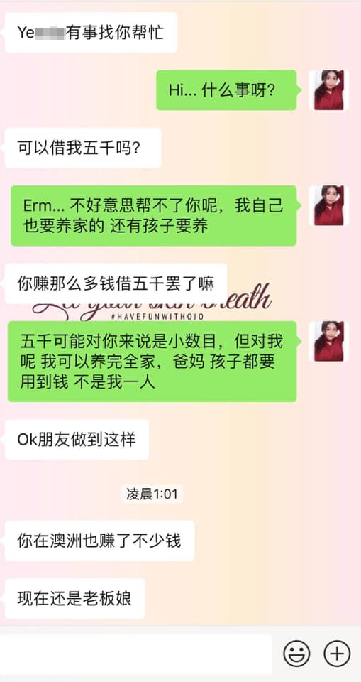 数日前,一位Y女士在其脸书分享了她的朋友向她借RM5000的谈话内容!