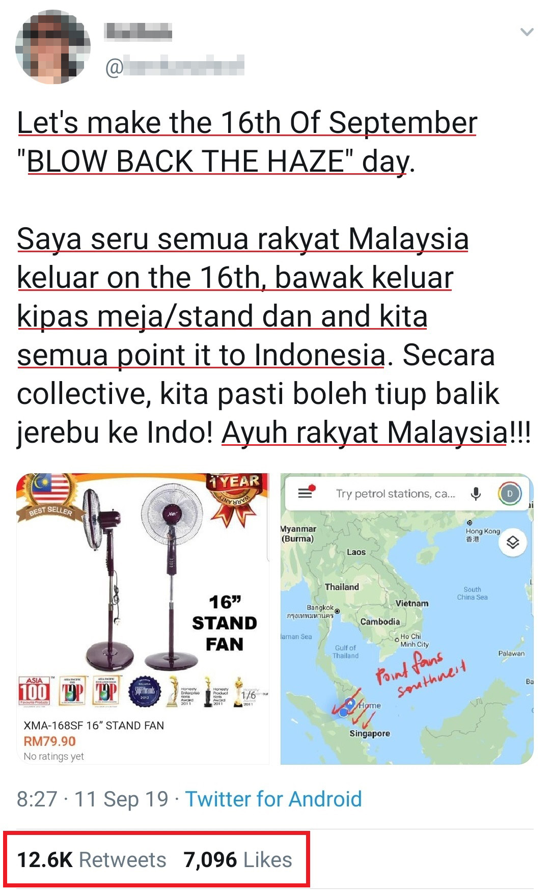该网友在帖文里写道:「把9月16日变成一个“吹走烟霾”的日子!我呼吁所有大马人民,在9月16日这天带着桌扇或站立式风扇一起出来,把风扇朝向印尼。团结起来,我们一定能够把烟霾吹回去!大马人,一起来吧!」