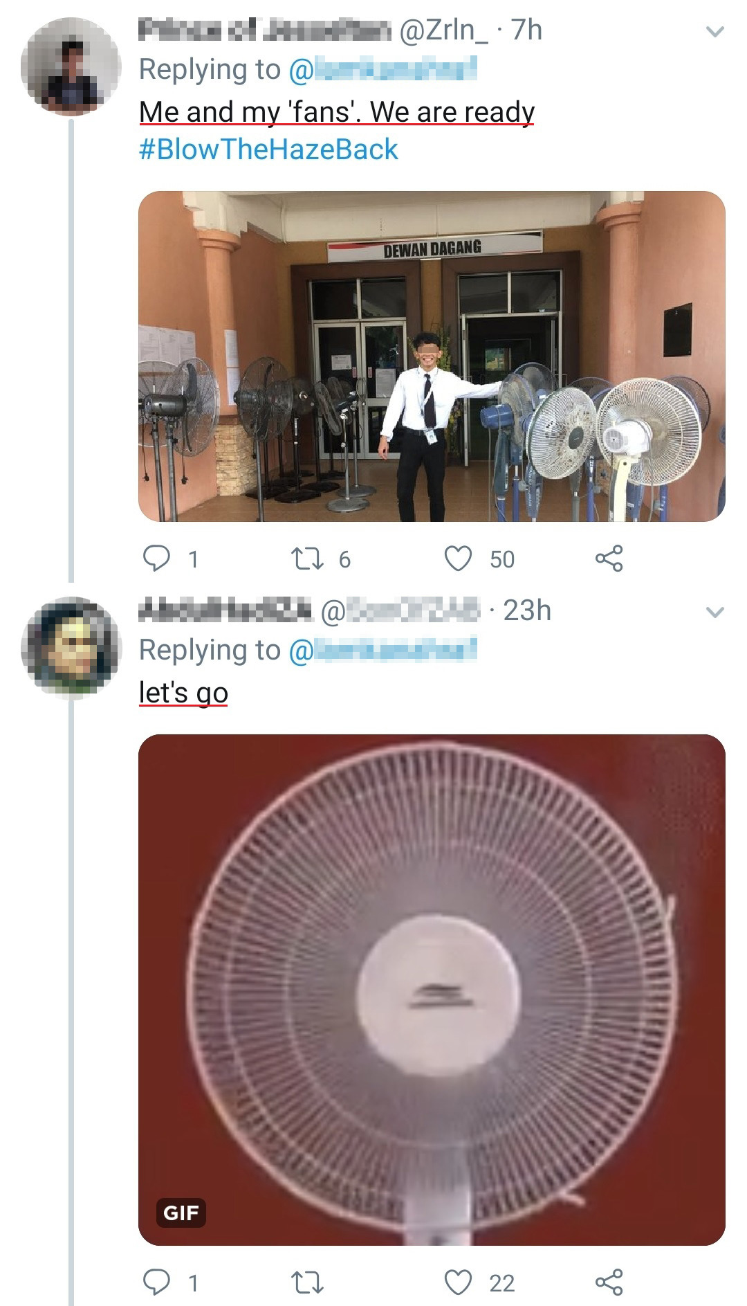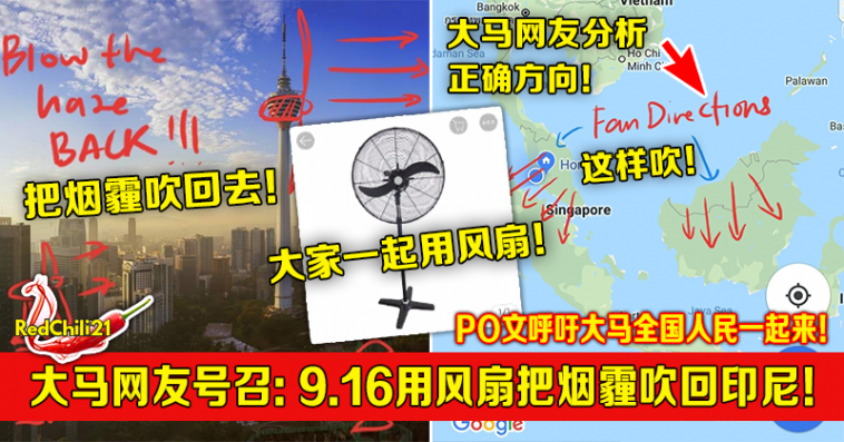 昨天(9月11日),一名大马网友想到一个听似荒唐的解决方法,在 Twitter 号召大马人民,用电风扇把烟霾吹回去印尼!