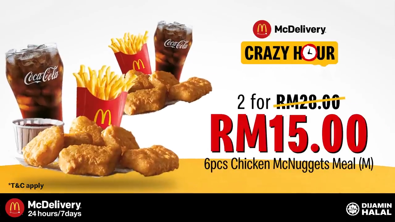▼  2x 6pcs Chicken McNuggets Crazy Hour Meal (M) 现在是 RM15.00(原价 RM 28.00)!