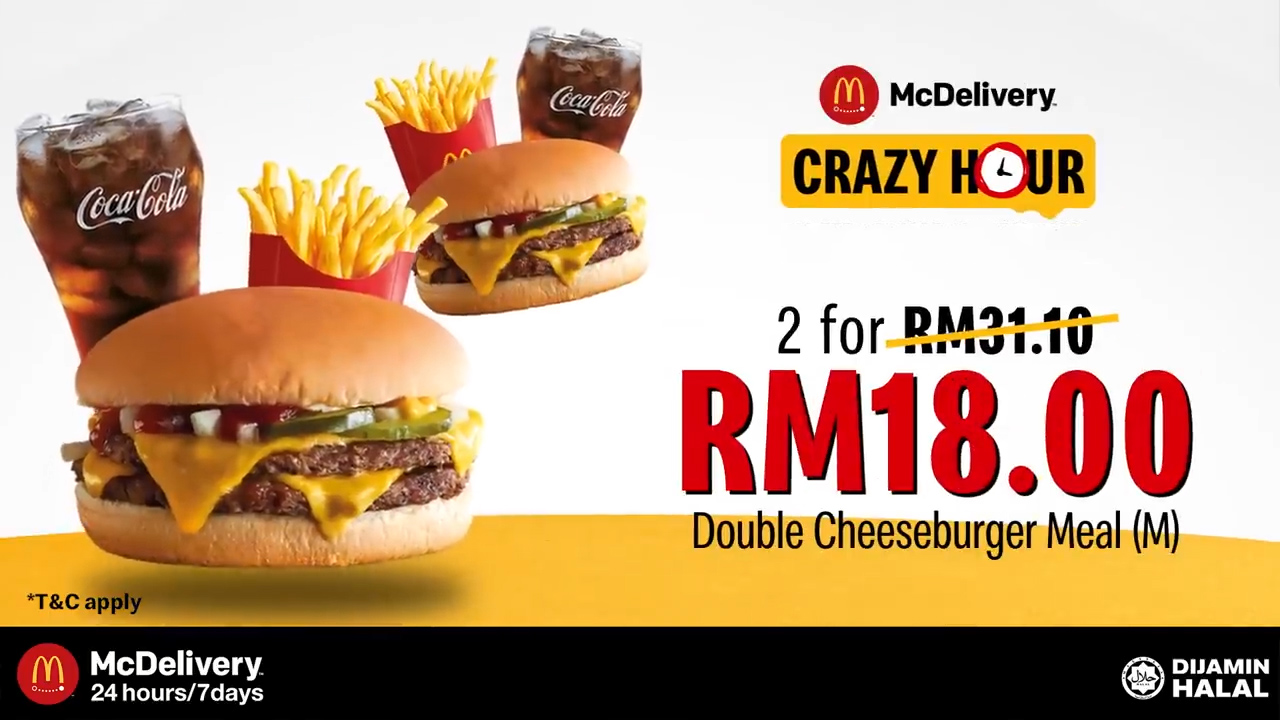 2x Double Cheeseburger Crazy Hour Meal (M) 现在是 RM18.00(原价 RM31.10)!