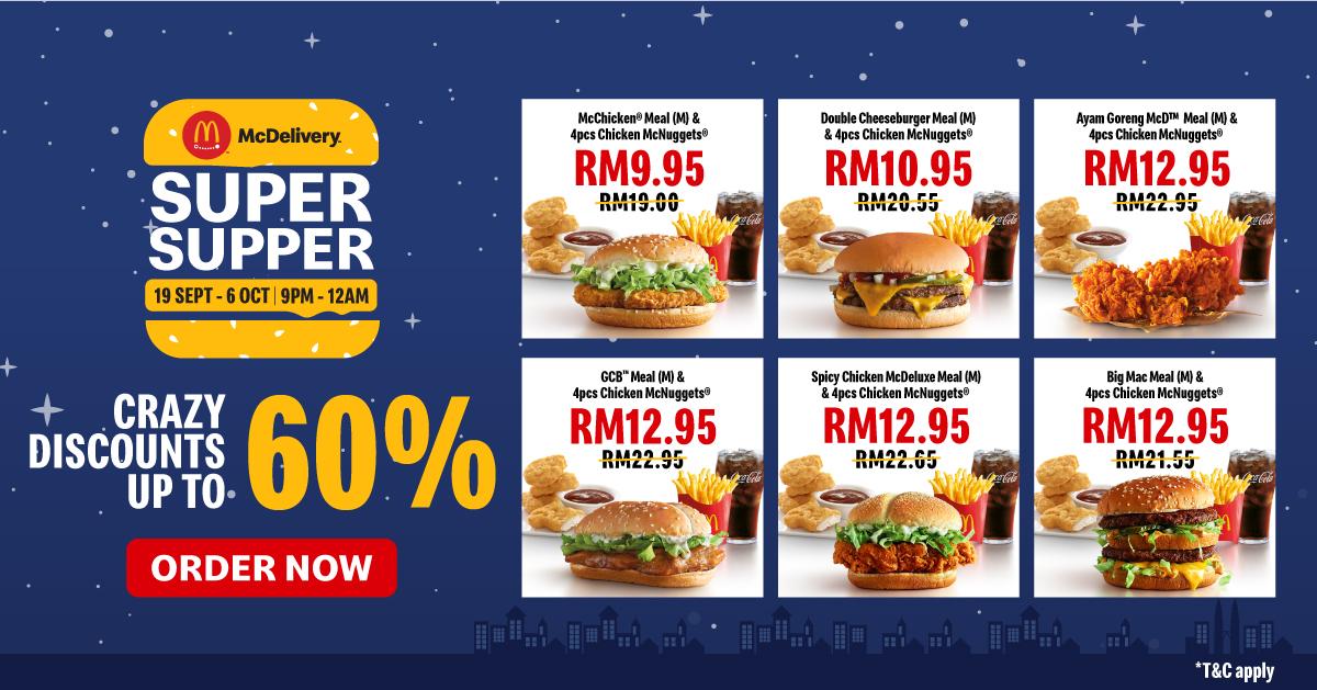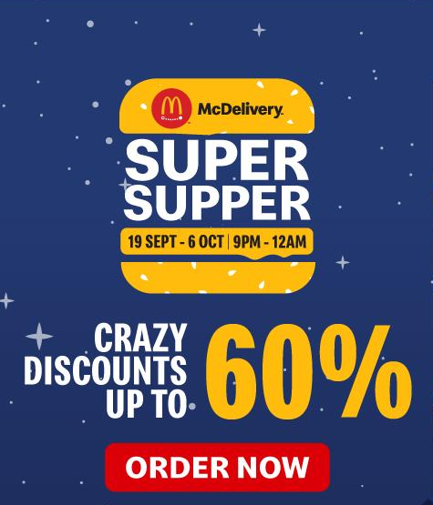 除此之外~如果你在夜间担心不懂要吃什么宵夜!这个月麦当劳推出McDelivery「超级宵夜」 60%折扣优惠啦!麦当劳就要让你吃到饱饱啦!