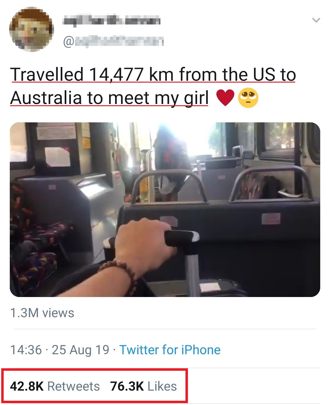 日前,一名大马男子在 Twitter 分享了一段视频,该视频的内容是,他克服了种种困难,从美国到澳洲(距离 14,477km)只为了见他心爱的女友!