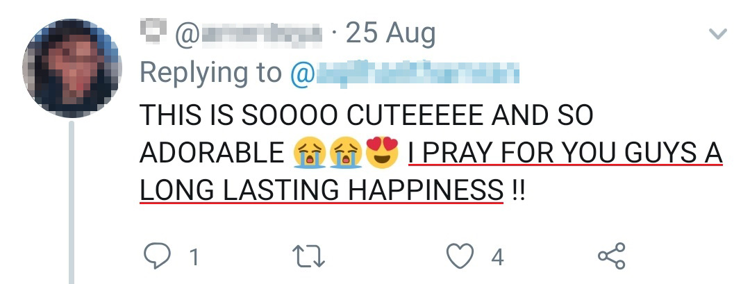 「我们在一起的时候就像好朋友互相分享心事,我们在一起很快乐也互相体谅。我们有信心只要双方一起努力,就能一直走下去!」