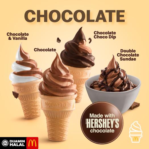 所有 Choco-holics 都会喜欢的巧克力甜点,这些甜点是用甜美的 Hershey’s 巧克力制成! 你可以选择巧克力和香草(Chocolate & Vanilla)、巧克力(Chocolate),巧克力配巧克力脆片(Chocolate Choco Dip),双倍巧克力雪糕(Double Chocolate Sundae),或者全部都尝试!