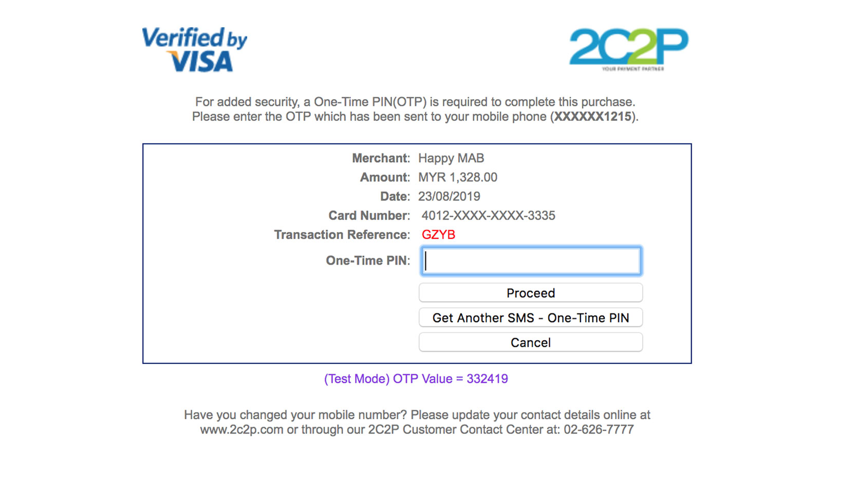 ▼ ④ 点击“Pay”后,手机将收到来自银行的 OTP 号码,把该 OTP 号码填入“One-Time PIN”,并点击“Proceed”。