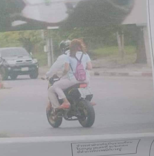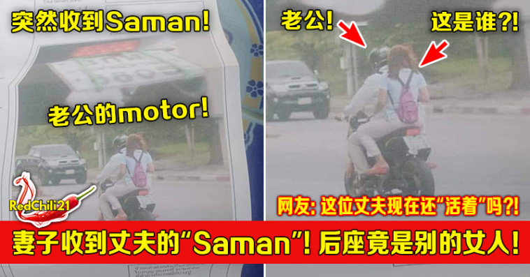 ▼ 照片里,她的丈夫骑着摩托车载着一名女子在马路上行驶,由于坐在后座的女子没有戴头盔,所以罚单就寄到了摩托车的主人,也是丈夫的家里。