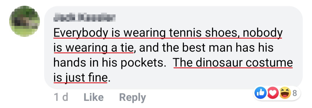 ▼「出席这场婚礼的每一位都是穿着运动鞋,没有人打领带。所以恐龙服OK的!」