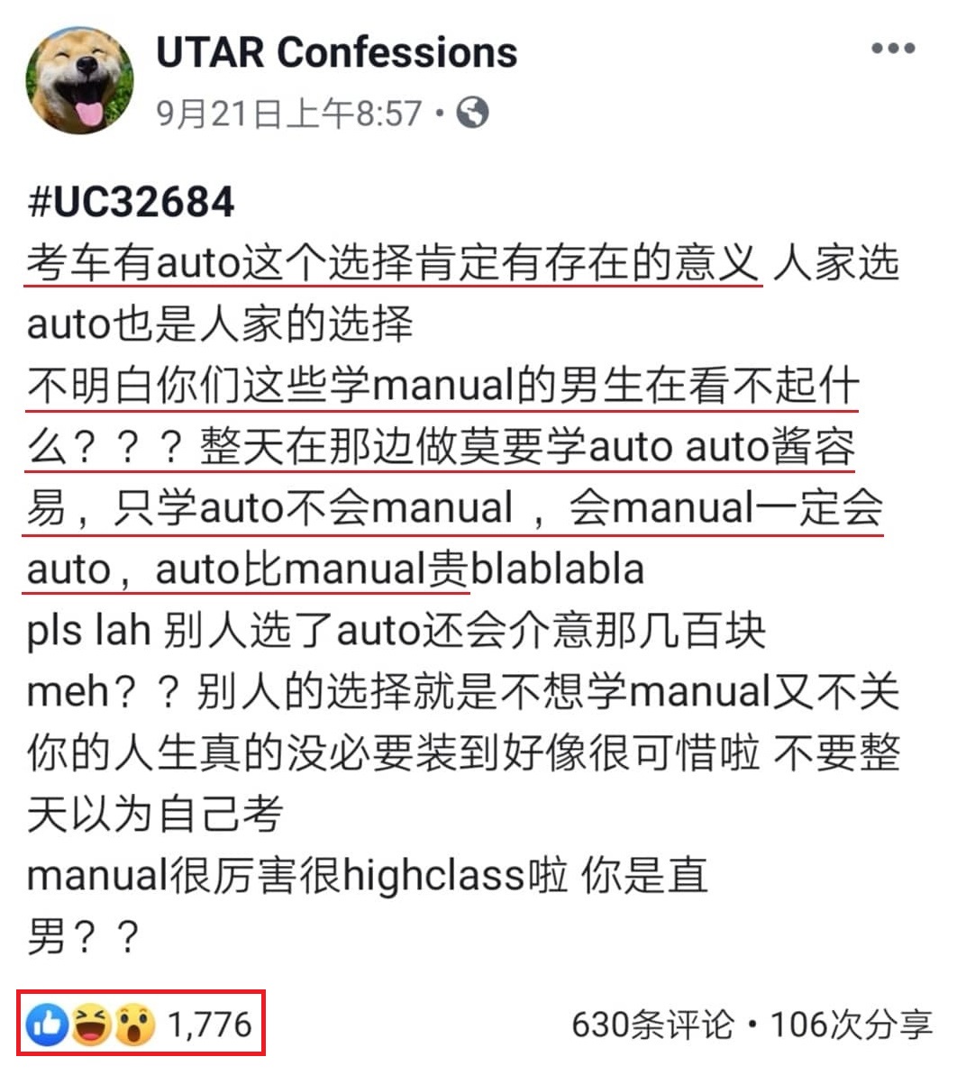 一则来自Utar Confessions面子书上传的一篇文章讲述「考车有Auto 这个选择肯定有存在意义,人家选择Auto 也是人家的选择」!