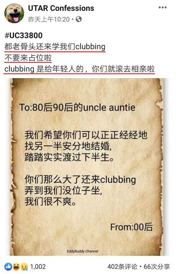 帖文的开头也单刀直入的:“「都老骨头还要来学我们Clubbing,不要来占位啦!Clubbing是给年轻人的,你们就滚去相亲啦」”!