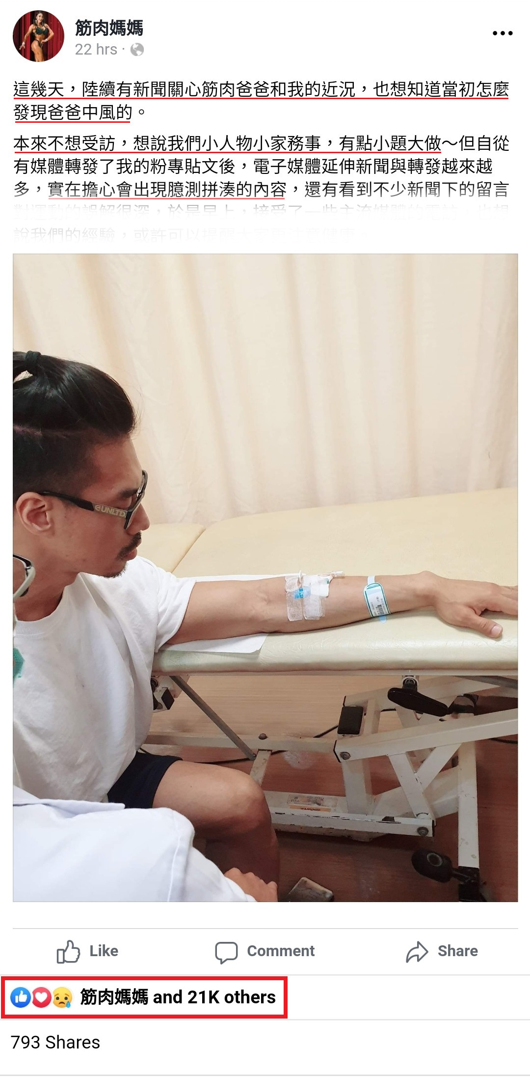 不料,同为健身达人的“筋肉妈妈”(妻子),近日在面子书PO文,写道:平时身强力壮的丈夫,突然中风倒下了!
