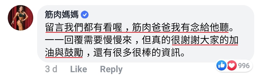 由于太多人留言问问题,因此后来,“筋肉妈妈”再发一则帖文,解释整件事情的来龙去脉。