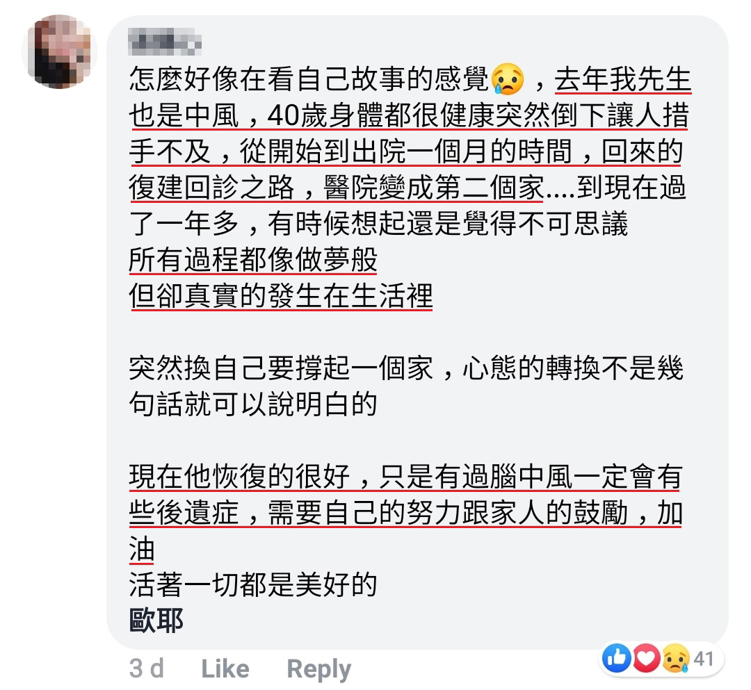 老公的复健之路,我相信也会是许多人需要的资讯;我们要更努力推广健康生活模式,正是因为爸爸之前身体质量好,所以中风后康复的速度也快了许多。