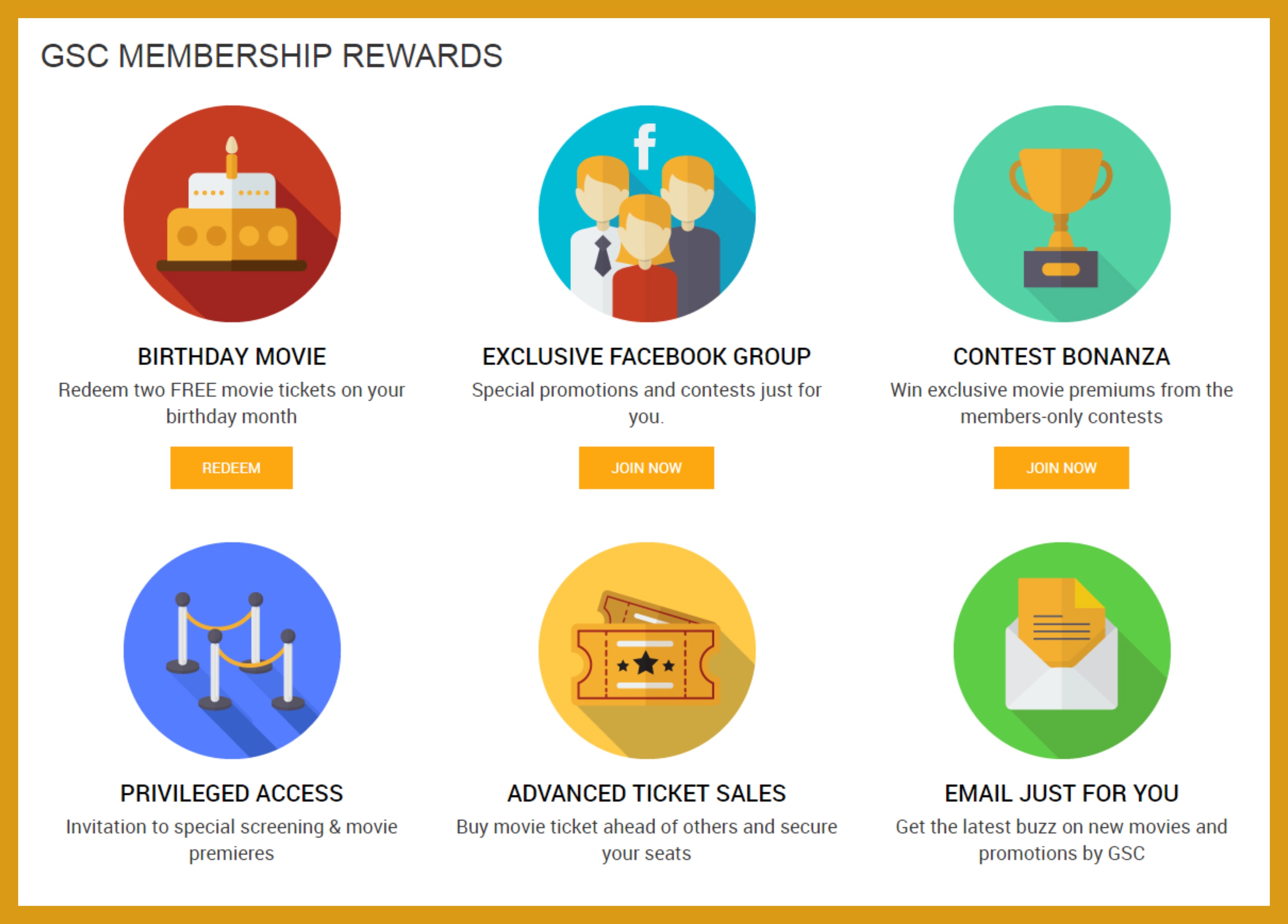 GSC 会员可以在生日的月份获得2张免费电影票。此项优惠只限 GSC Website Members。