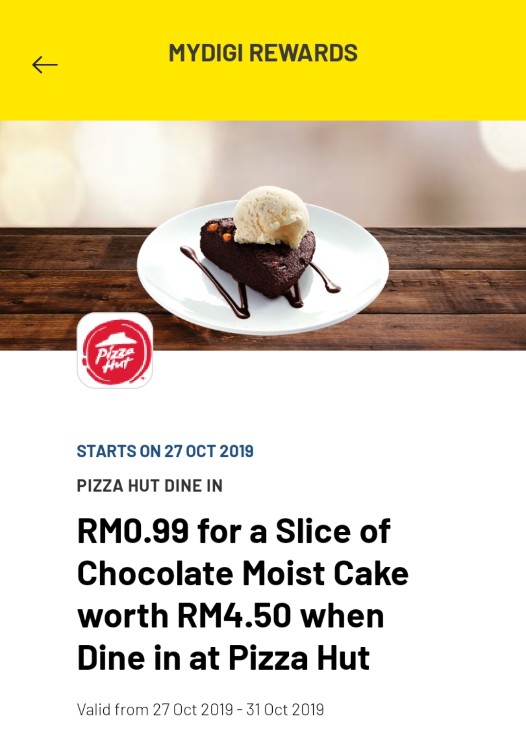 ▼ ③ Pizza Hut 一块 Chocolate Moist Cake 现在只需 RM0.99(原价 RM4.50)!