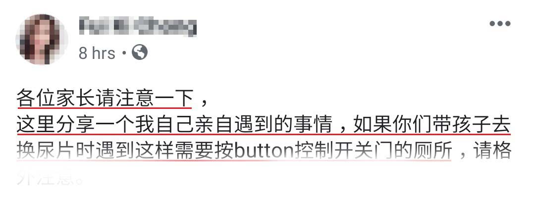 这里分享一个我自己亲自遇到的事情,如果你们带孩子去换尿片时,遇到这样需要按button控制开关门的厕所,请格外注意!