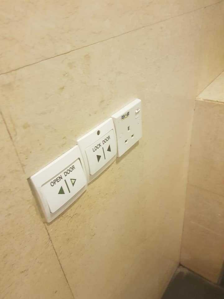 这间厕所就是文上所提的,那种需要自己按button控制开关门的厕所。我按button开门进去后,按关门键时,门却没有自动关上。按了几次没反应后,我唯有选择出去再选另一间厕所。