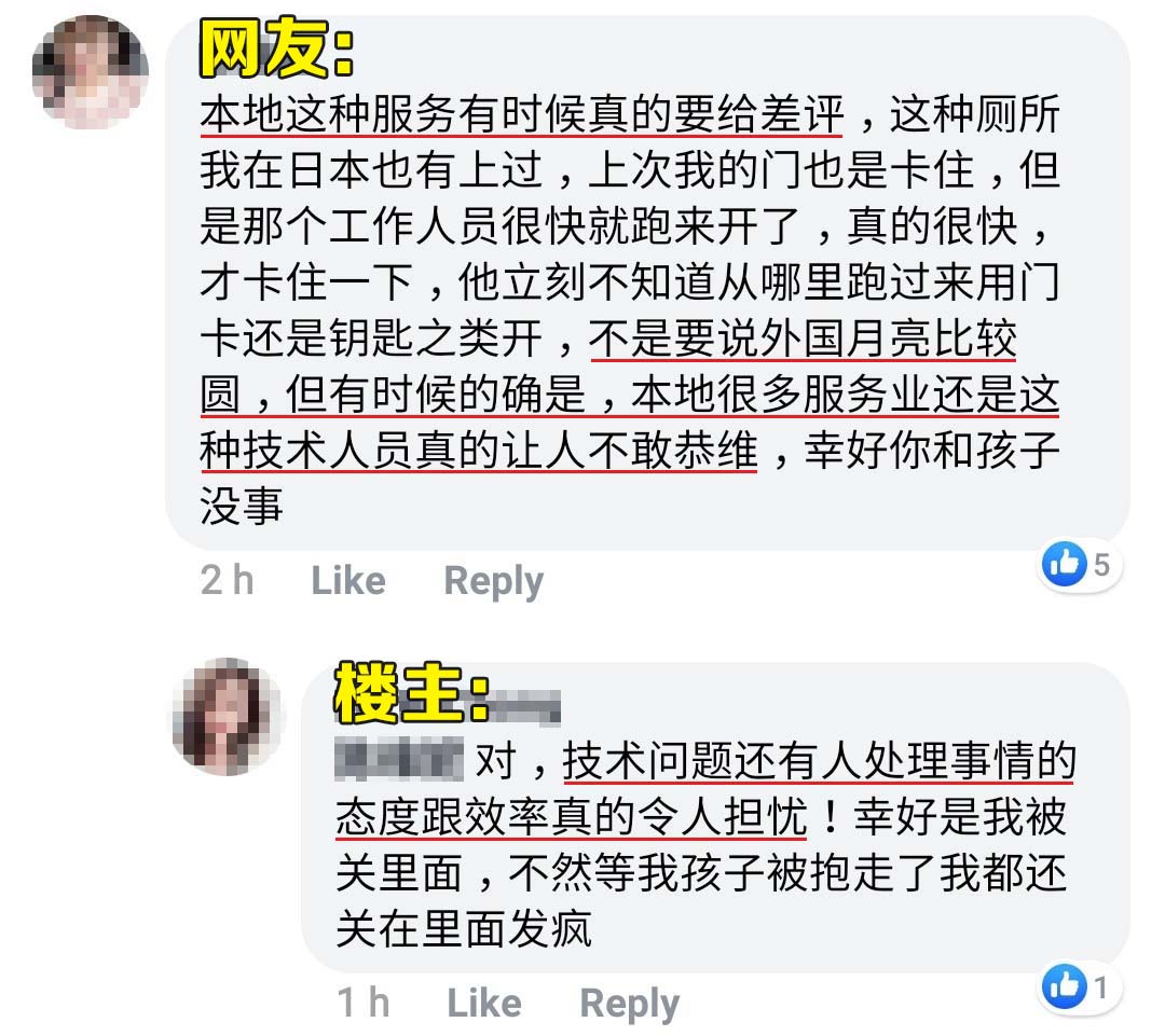 我跑过去了赶紧跟他说:「麻烦你跟住我,我的孩子在前面厕所被反锁了,你可以跟着我去开门吗?我孩子才21个月大!」