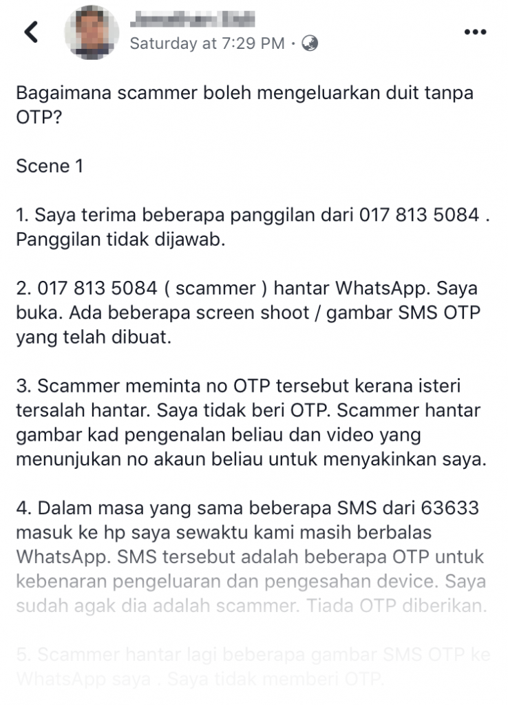 不过近日大马一名男子在面子书上发帖痛骂骗子在无需“一次性密码”(OTP)的情况下成功转走他银行里的钱!