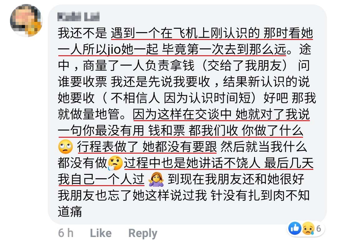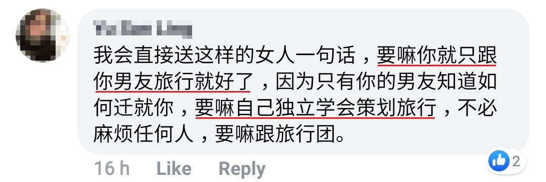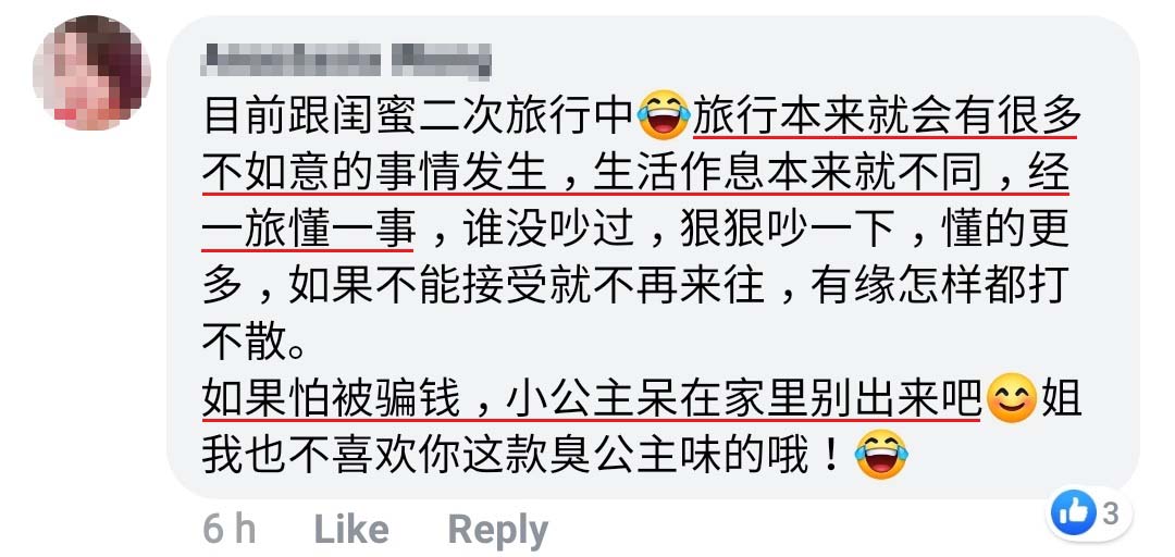 出门旅行,选择旅伴是非常重要的一件事!一名大马女子在面子书分享,她最近一次的旅行经历,所谓「猪一般的队友」应该可以用来形容,她这位公主病的旅伴!