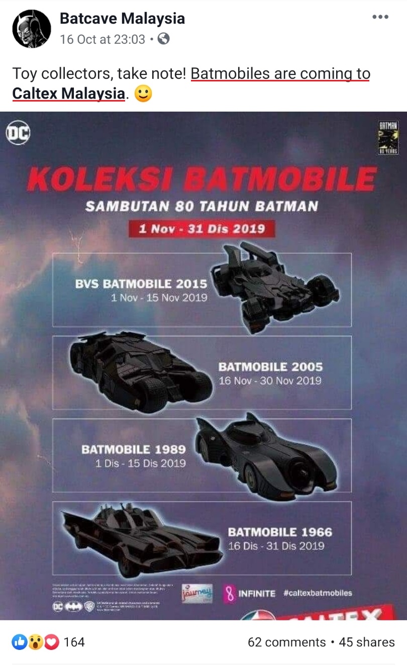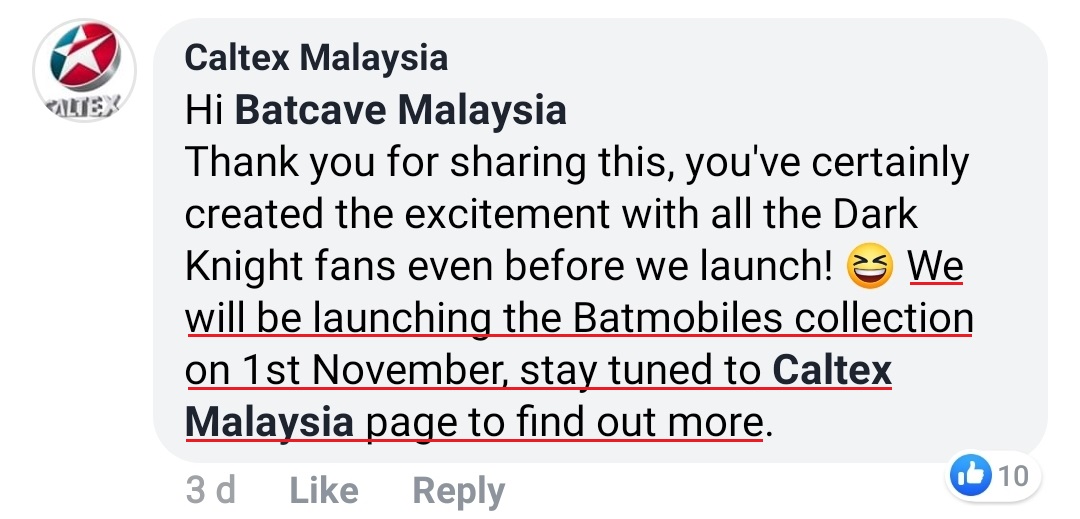 ▼ 大马 Caltex 官方面子书留言写道:「我们将在11月1日正式推出 Batmobiles 系列,请密切官方专页以了解详情!」