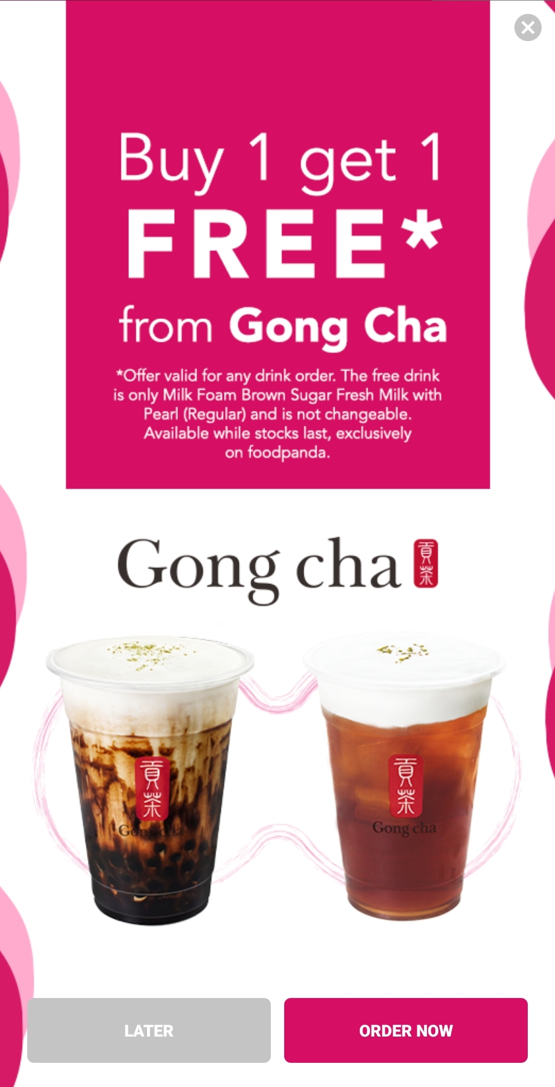 通过 Foodpanda 购买 Gong Cha 珍珠奶茶,只要购买任何1杯,就免费送1杯黑糖鲜奶珍珠(Brown Sugar Fresh Milk with Pearl)!