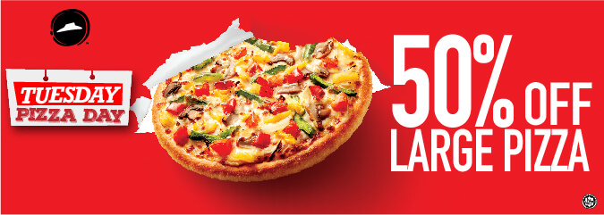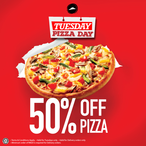 即日起,大马 Pizza Hut 推出星期二大优惠,无论是 Regular Pizza 或 Large Pizza,都折扣50%!可节省高达 RM18.95 哦!